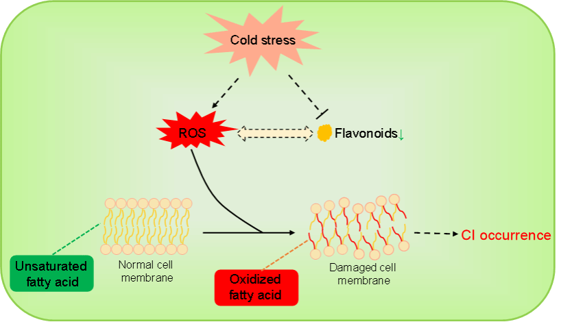 该研究通过整合表型、生理、分子生物学和多组学数据,系统揭示了采后黄瓜的冷害发生机制。首次提出黄酮类化合物的代谢在冷害发生过程中可能扮演重要作用。低温胁迫引起黄酮类化合物含量的减少可能削弱采后黄瓜的ROS代谢能力,从而加剧膜脂代谢和过氧化,最终导致冷害的发生。该研究为理解采后黄瓜冷害发生机制提供了全新视角,为调控采后黄瓜及其他果蔬冷害新思路和新策略的形成提供了关键的理论依据。