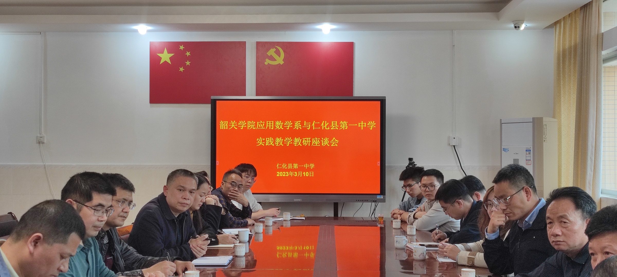 仁化县第一中学校长谢普纲、党总支副书记谢祖福及老师代表等对应用数学系一行的到来表示热烈欢迎,谢校长简要介绍了学校发展状况、实习基地建设及实习生工作等情况,希望与地方高校搭建党建引领,联谊共建,服务地方发展的合作平台。