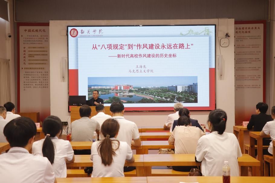 王海龙结合党史上的作风建设,详细阐述了中央八项规定与七届二中全会“六条规定”的历史对照与时代意义。他通过阐释新时代党的作风建设的历史逻辑、理论逻辑、实践逻辑等“三重逻辑”,强调加强党的作风建设是新时代全面从严治党的突破口和重要标志,指出作风问题关乎人心向背 关乎党的生死存亡、关乎党和国家事业兴衰成败,需要锲而不舍贯彻中央八项规定精神,不断将作风建设引向深入。勉励大家要以中央八项规定为行为准则,以作风建设新气象赢得师生群众信任拥护。