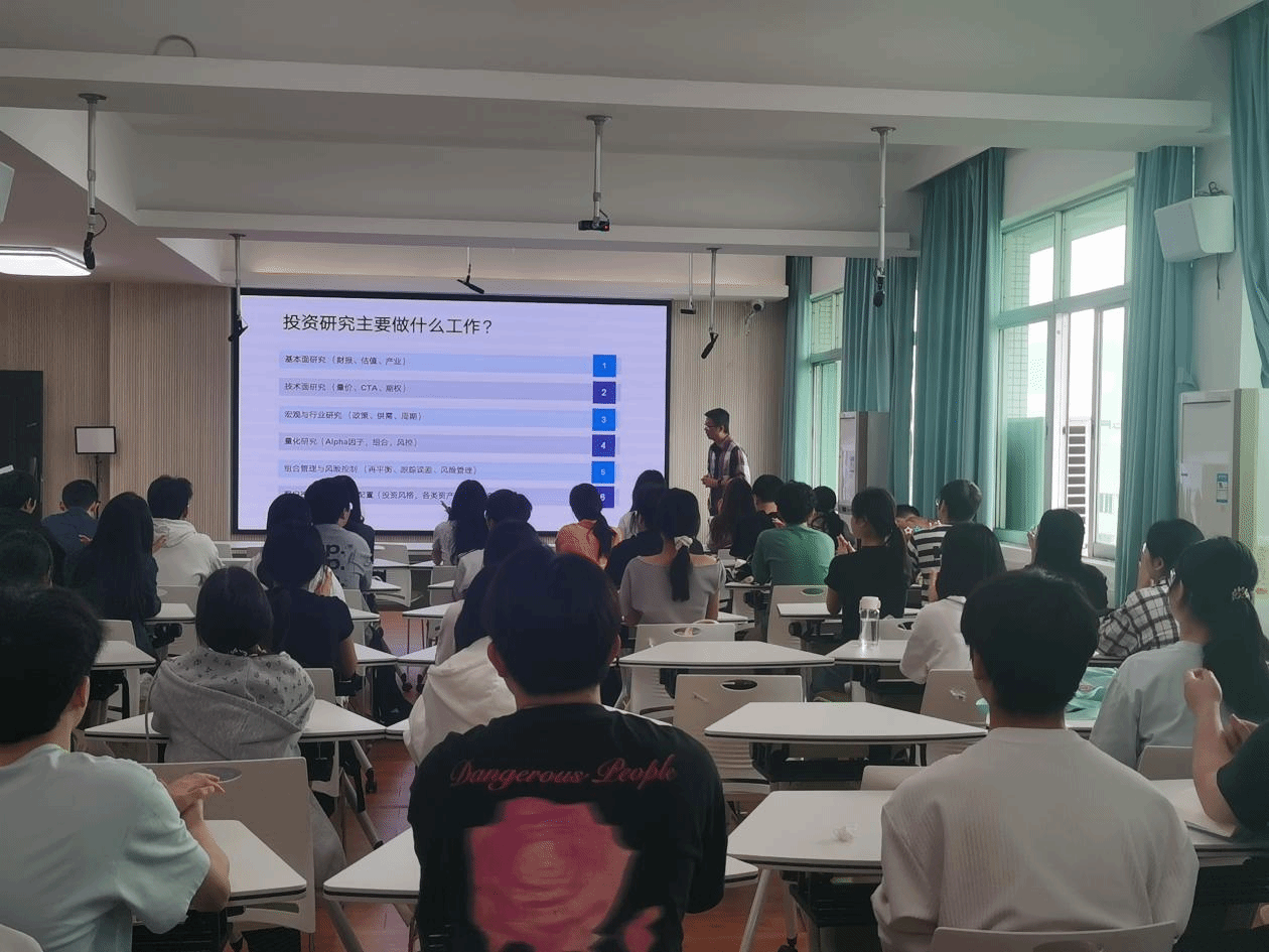 在当天上午,邓丽老师讲授的《专业核心技能训练》23级统计学01班课堂上,深圳点宽网络科技有限公司董事长黄嵩聚焦“数据与统计在金融投研方向的应用”,展示了统计学方法与人工智能技术如何在量化投资、智能投研、风险管理等领域协同发力。作为拥有17年金融行业从业经验的资深专家,黄嵩先生曾主导多个千万级大型金融应用系统项目,并长期致力于智能投研与投研一体化的商用实践。他从量化投资、风险管理到APP生成,逐一演示了AI如何重塑金融行业的工作流程,还特别强调了分布式技术在金融场景中的价值,并提醒同学们在拥抱技术的同时,必须夯实统计学与数据科学基础,提升模型解释与业务洞察能力。