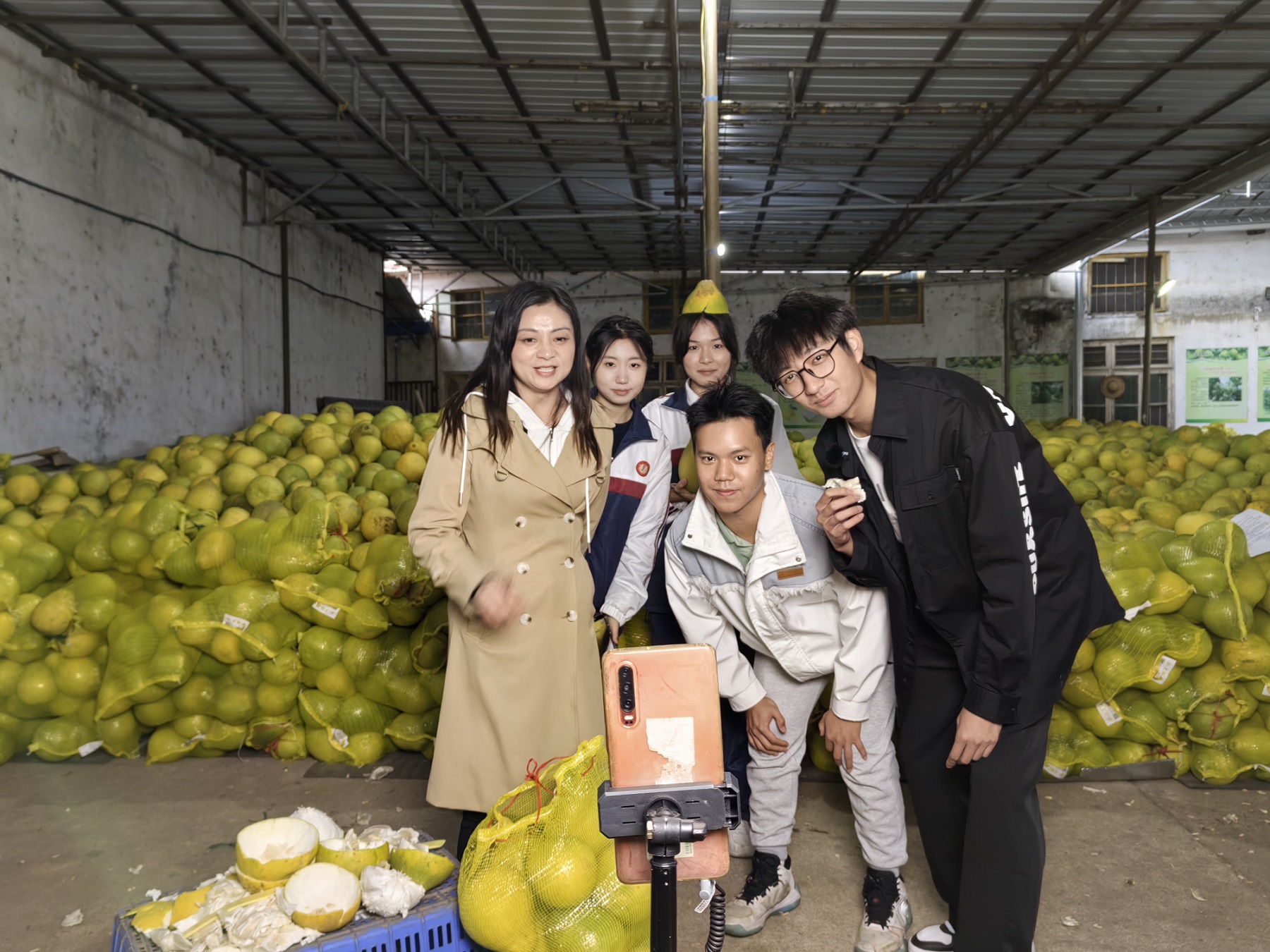 金秋柚果飘香,校企携手赋能。11月12日,数学与统计学院“直播团队”携手韶关邮政赴仁化县大桥镇长坝村金果农业生态园开展“金果柚”直播志愿服务活动。韶关邮政主播童桂伟与我院学生主播5人共同参与。
