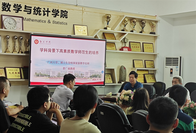 9月15日下午,广州大学博士生导师、国家级教学名师曹广福教授应邀来到数学与统计学院,开展以学科背景下高素质数学师范生培养为主题的精彩讲座。学院老师们积极参与了本次讲座,共同探讨在当前的教育背景下,如何为培养优秀的师范毕业生作出贡献。