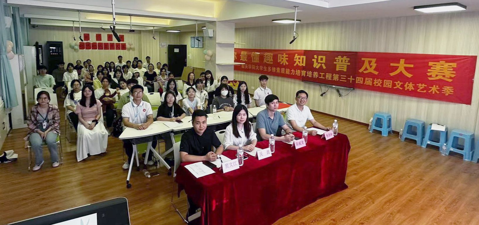 为激发广大学生学习、认识科普的兴趣,营造崇尚科学、追求真知、勤奋学习、锐意创新的浓厚氛围5月12日,韶关学院第三十四届校园文体艺术季之“你最懂趣味知识普及大赛”决赛于旅港楼B603开帷幕。本次比赛的嘉宾有:英东生物与农业学院团委指导老师陈威龙教育科学学院教师吴茵数学与统计学院辅导员窦文江李泽坤。
