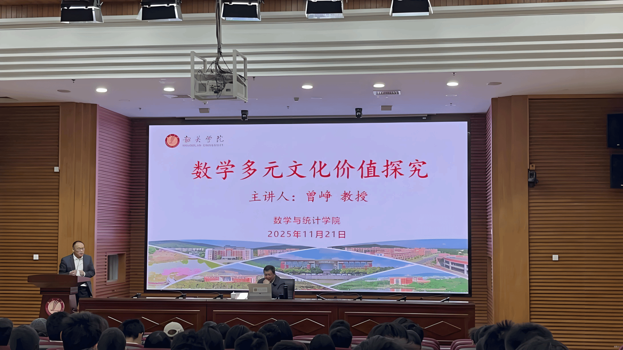 11月21日下午,韶关学院图书馆学术报告厅内座无虚席、氛围热烈,一场以“数学多元文化价值探究”为主题的学术讲座在此隆重开讲。特邀主讲嘉宾佛山大学党委原书记曾峥教授,韶关学院副校长田广增,数学与统计学院党委书记邓春林、党委副书记肖和平,学院办公室副主任张亚妹及副科级辅导员窦文江出席,256名师生齐聚一堂,共同赴约这场兼具思想深度与文化温度的数学文化盛宴。