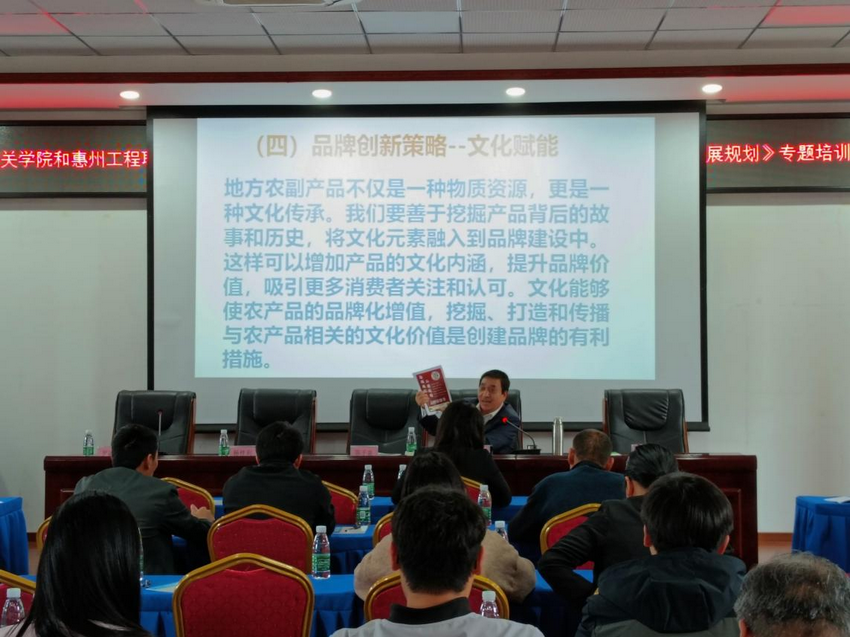 此次专题培训是在调研南雄市新型农业经营主体培训需求的前提下开展的。商学院团队自2023年10月开始,针对南雄市农业企业、种植大户、家庭农场等新型农业经营主体在农产品营销与品牌建设方面的困境展开了调查与诊断。杨树臣在培训中将品牌营销理论与南雄农产品特色紧密结合,对农产品营销的产品策略、价格策略、渠道策略以及促销策略等进行专业科学和深入的培训与指导。杨树臣现场为学员们展示了商学院师生精心打造的南雄农产品品牌策划书,并以此作为品牌策划的示范案例。培训课堂教学设计针对性极强、气氛活跃、生动有趣、互动频繁,学员们纷纷表示受益匪浅,深受启发,承诺今后将所学知识转化为农业生产的强大动力,学以致用,学有所用,学用结合。