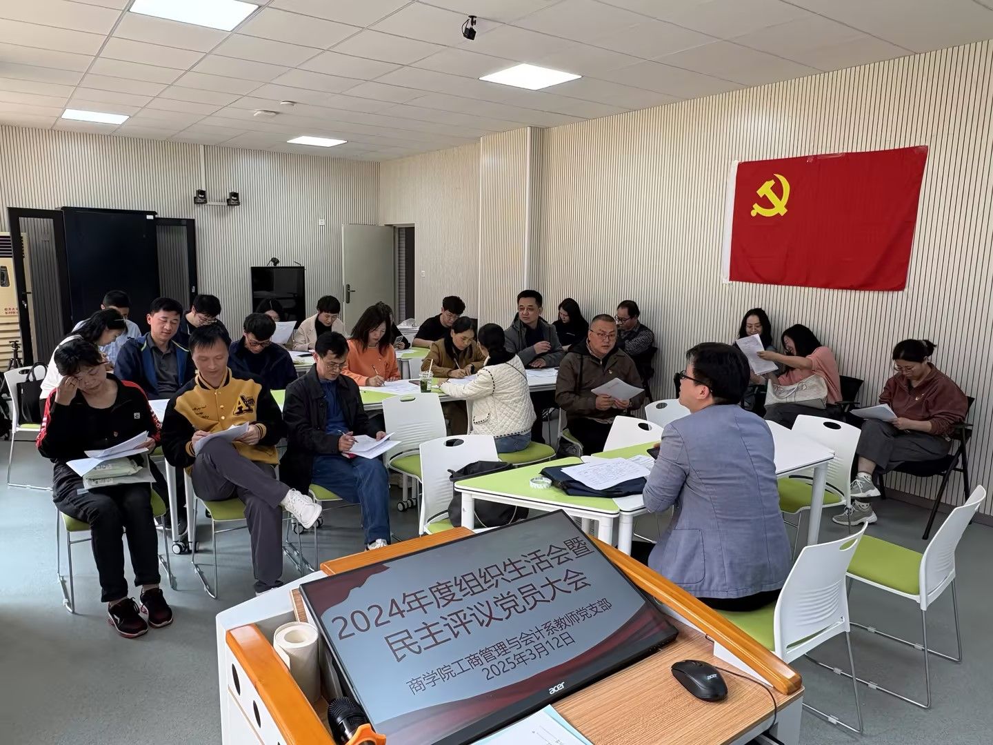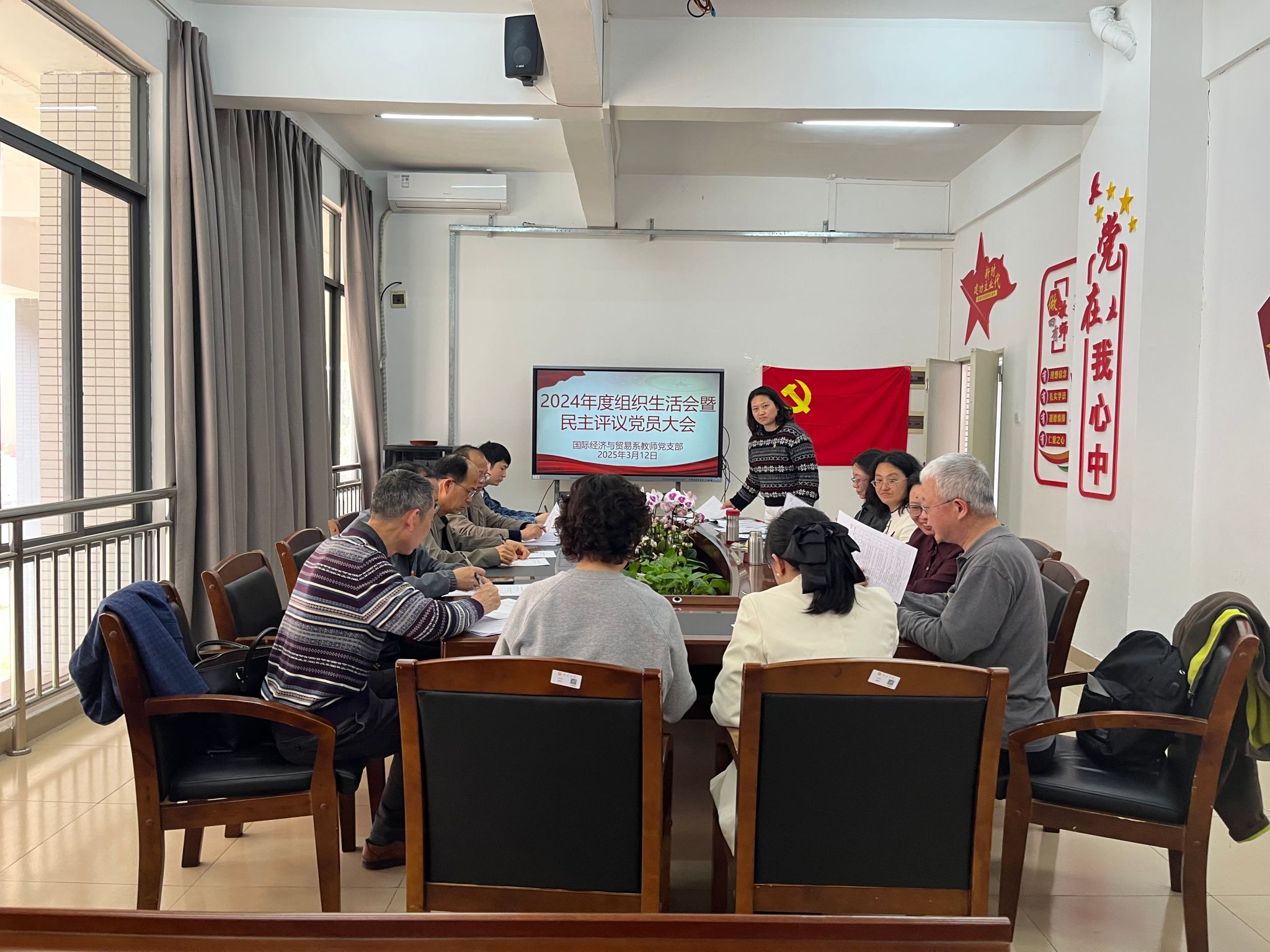 根据学校的统一部署,2025 年3月12日下午,商学院国际经济与贸易系、工商管理与会计系两个教师党支部分别在文德楼214、116室召开2024年度组织生活会暨民主评议党员大会。两个支部的党员教师出席了此次会议,会议分别由党支部书记刘红英、欧阳博强主持。