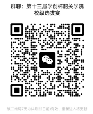 1.加入社群:所有拟报名的师生请加入“第十三届学创杯韶关学院校级选拔赛”微信群(见下图群二维码),以便咨询和接收培训通知。