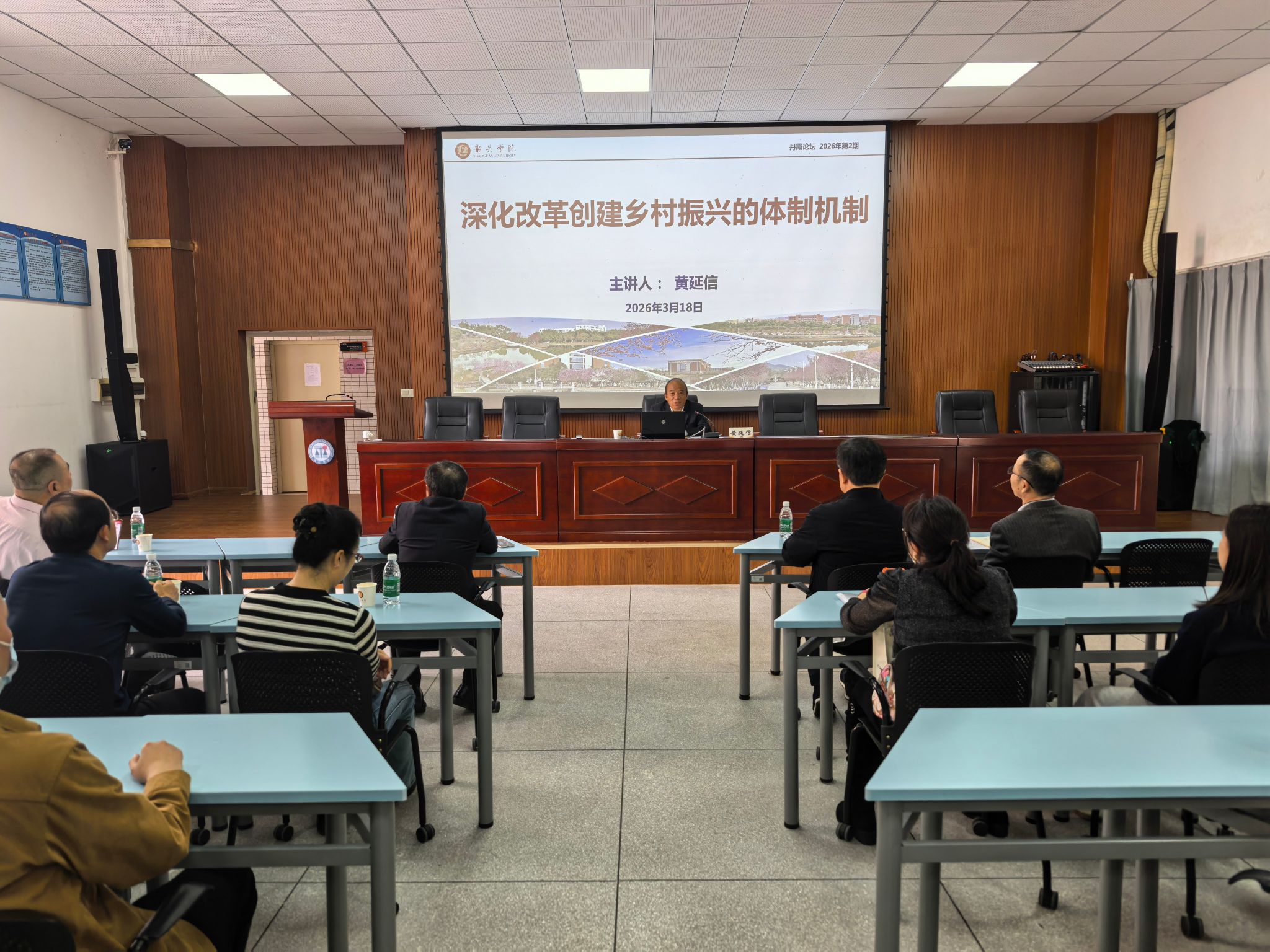 为深化农村发展学科建设、助力数字经济硕士点申建与人才培养,搭建高水平学术交流平台,3 月 18 日下午,韶关学院 “丹霞论坛 2026 年第 2 期” 暨 “商学院风采系列学术讲座 2026 年第 1 期” 在文德楼100课室顺利举办。本次论坛特邀中国农业经济学会副会长、农业农村部原巡视员黄延信作主题报告,学校广大师生及相关领域同仁齐聚现场,共赴这场乡村振兴领域的学术盛宴。论坛由学校科学技术部部长付永主持。