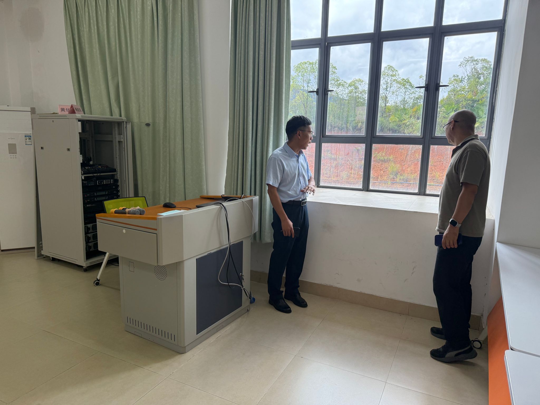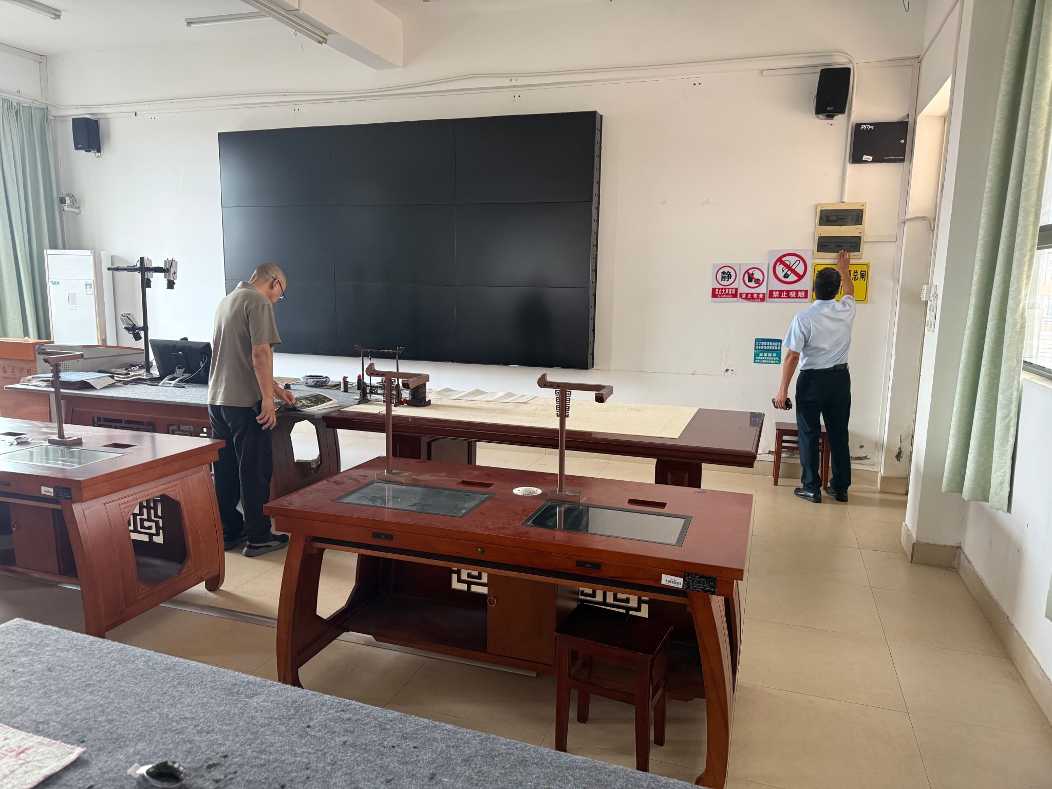 9月末台风“桦加沙”过境,文学与传媒学院开展国庆中秋小长假前实训室安全检查。学院党委书记骆雄辉、院长仲红卫一行,在位于知遇楼的教师口才实训室和汉字书法实训室分别就用电安全、防雨防风、防蚊灭蚊和环境卫生进行了全面检查。领导们在检查过程中发现一些松动老化的电源开关以及变形的窗户把手,并对卫生死角进行了查看和清理。