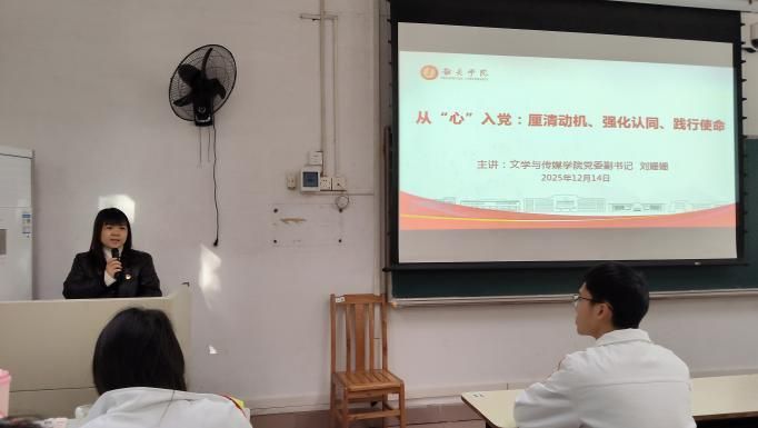 12月14日上午,文学与传媒学院党委副书记刘姗姗以“从‘心’入党:厘清动机、强化认同、践行使命”为主题,在树德楼C101室为第一期入党申请人教育培训班作专题教学。