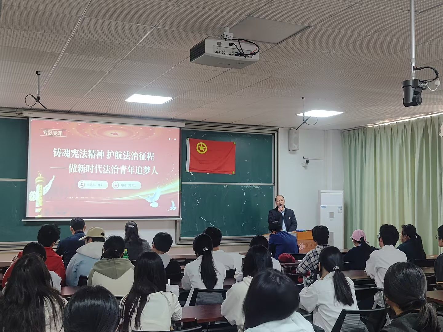 活动伊始,廖星书记结合“12·4”第12个国家宪法日宣教工作要求,以“铸魂宪法精神 护航法治征程——做新时代法治青年追梦人”为题讲授专题党课。他立足数字媒体技术专业特色,结合行业典型案例,用生动鲜活的表述阐释宪法核心要义与法治实践要求,引导学生将法治思维融入专业学习与未来职业发展,助力青年学子树立正确的法治观与价值观。