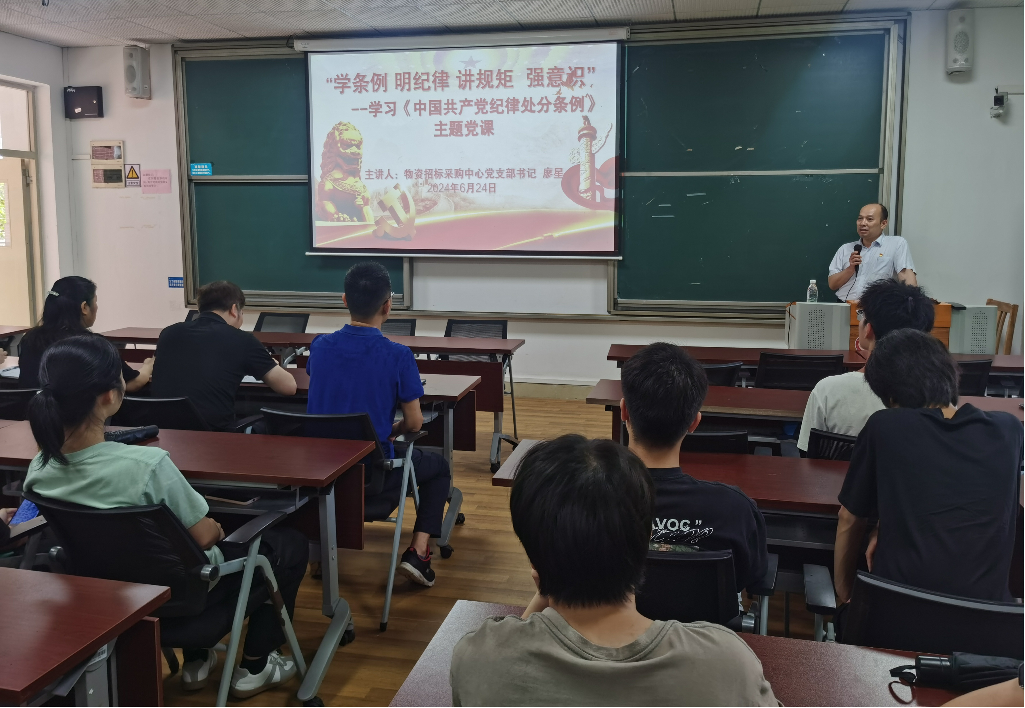 为进一步推动党纪学习教育走深走实,教育引导党员干部学纪、知纪、明纪、守纪,6月24日下午,物资招标采购中心党支部书记廖星在知礼楼204课室讲授党纪学习教育专题党课。
