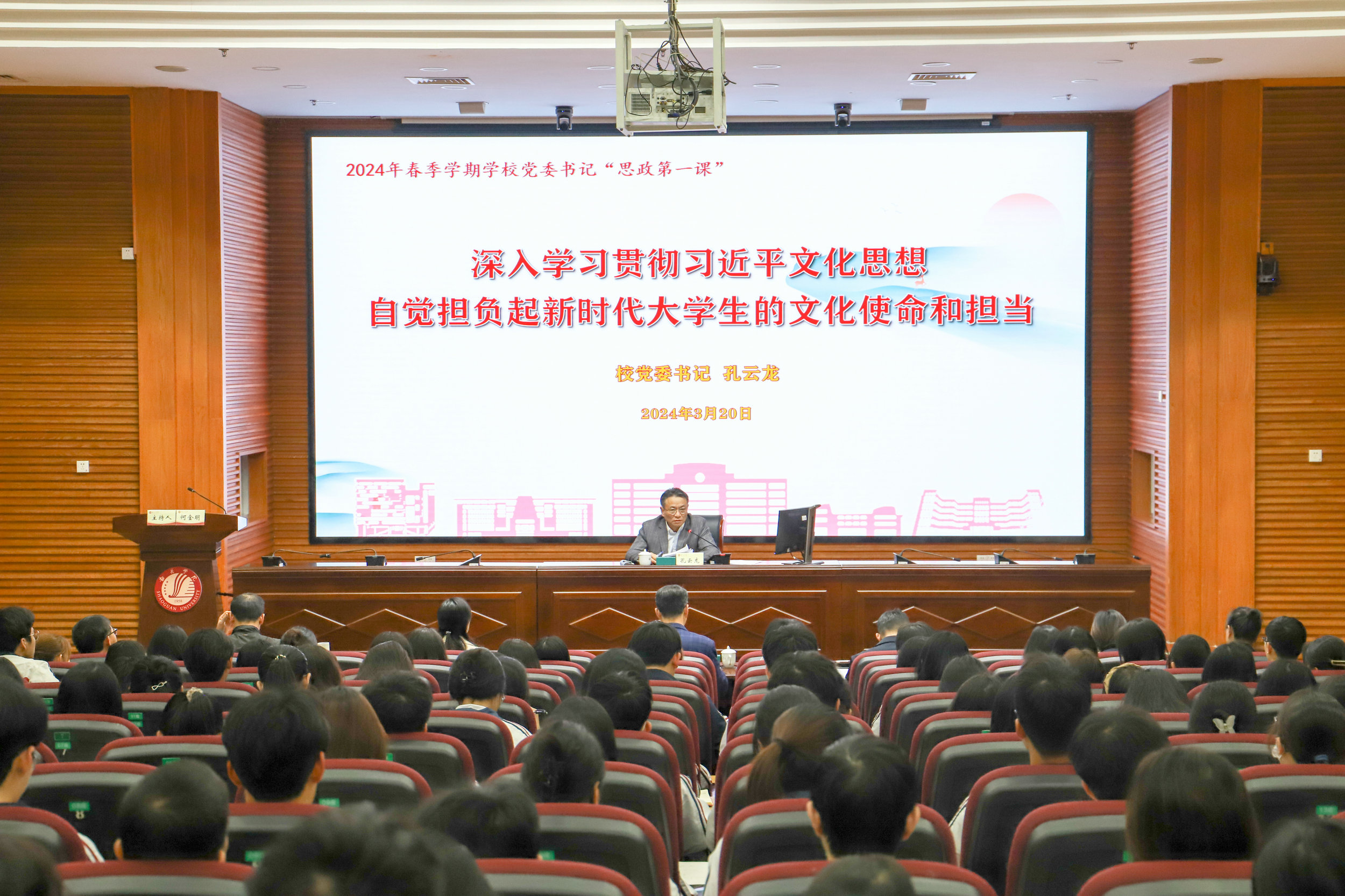 3月20日,我校党委书记孔云龙以《深入学习贯彻习近平文化思想 自觉担负起新时代大学生的文化使命和担当》为题在明德楼学术报告厅开讲“思政第一课”。本次“思政第一课”由学校副校长何金明主持。