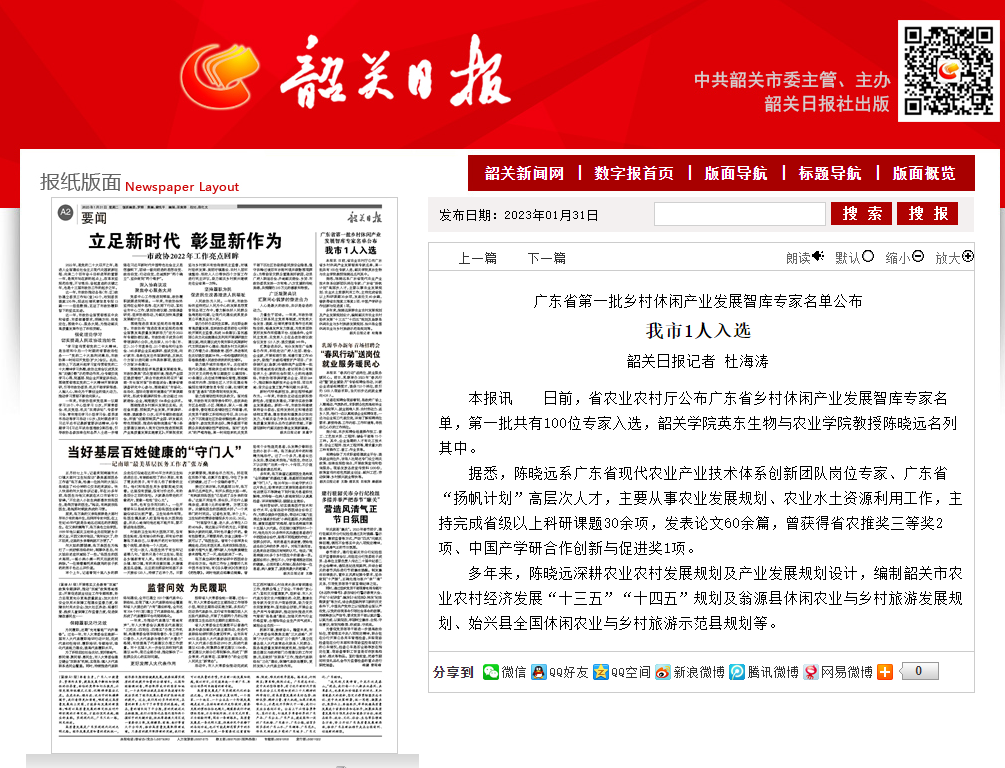 本报讯 日前,省农业农村厅公布广东省乡村休闲产业发展智库专家名单,第一批共有100位专家入选,韶关学院英东生物与农业学院教授陈晓远名列其中。