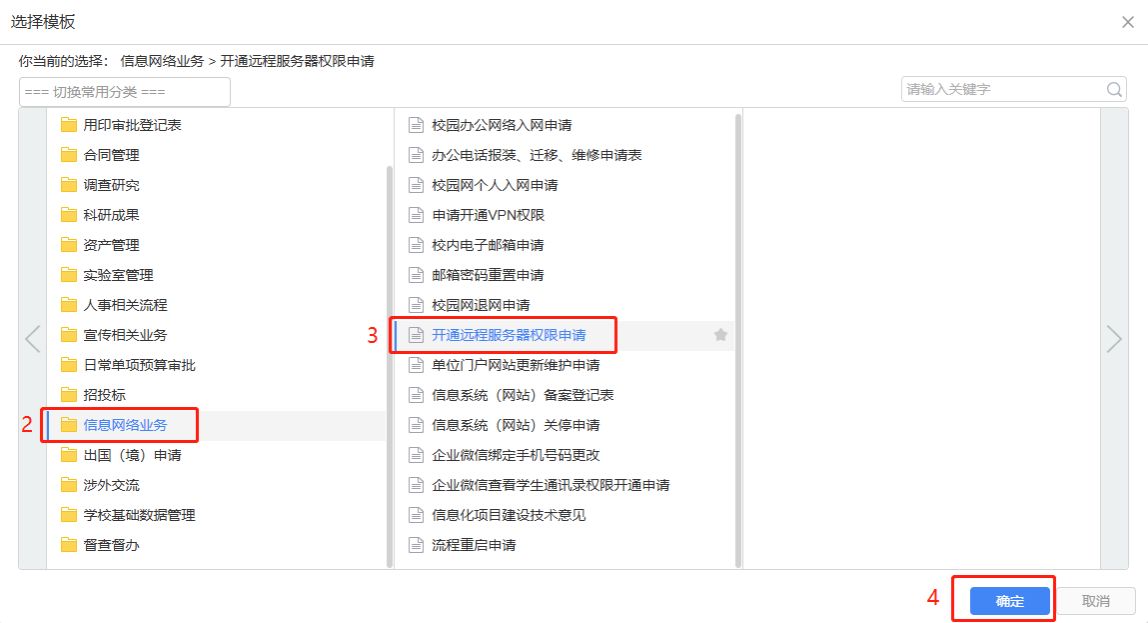 2、进入OA系统后,点击“发起流程”,在弹出的模板窗口点击“信息网络业务”,在右边列表点击“开通远程服务器权限申请”,点击“确定”即可打开申请表,如实填写相关信息后点击“提交”即可发起申请,进入审批处理流程。