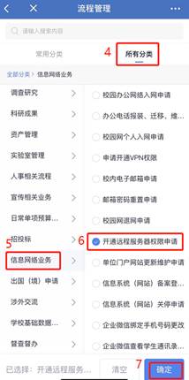 1、使用手机登陆企业微信,点击“工作台”选项卡—>点击“事务申办”图标—>点击底部“新建流程”—>点击“所有分类”选项卡—>点击“信息网络业务”,选择“开通远程服务器权限申请”—>点击“确定”打开申请表,如实填写相关信息后点击“提交”即可发起申请,进入审批流程。