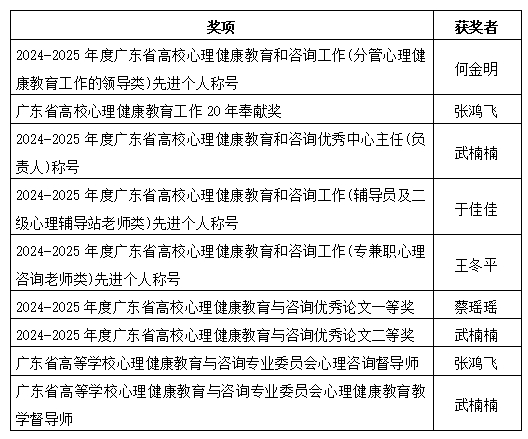 2025年11月3日至4日,2024—2025年度广东省高校心理健康教育与咨询专业委员会学术年会在中山国际酒店隆重召开。来自全省各高校的心理健康教育负责人、心理咨询专家及辅导员代表齐聚一堂,共同交流新时代心理健康教育工作的创新经验与发展路径。我校受邀参会,并在大会上喜获多项荣誉。