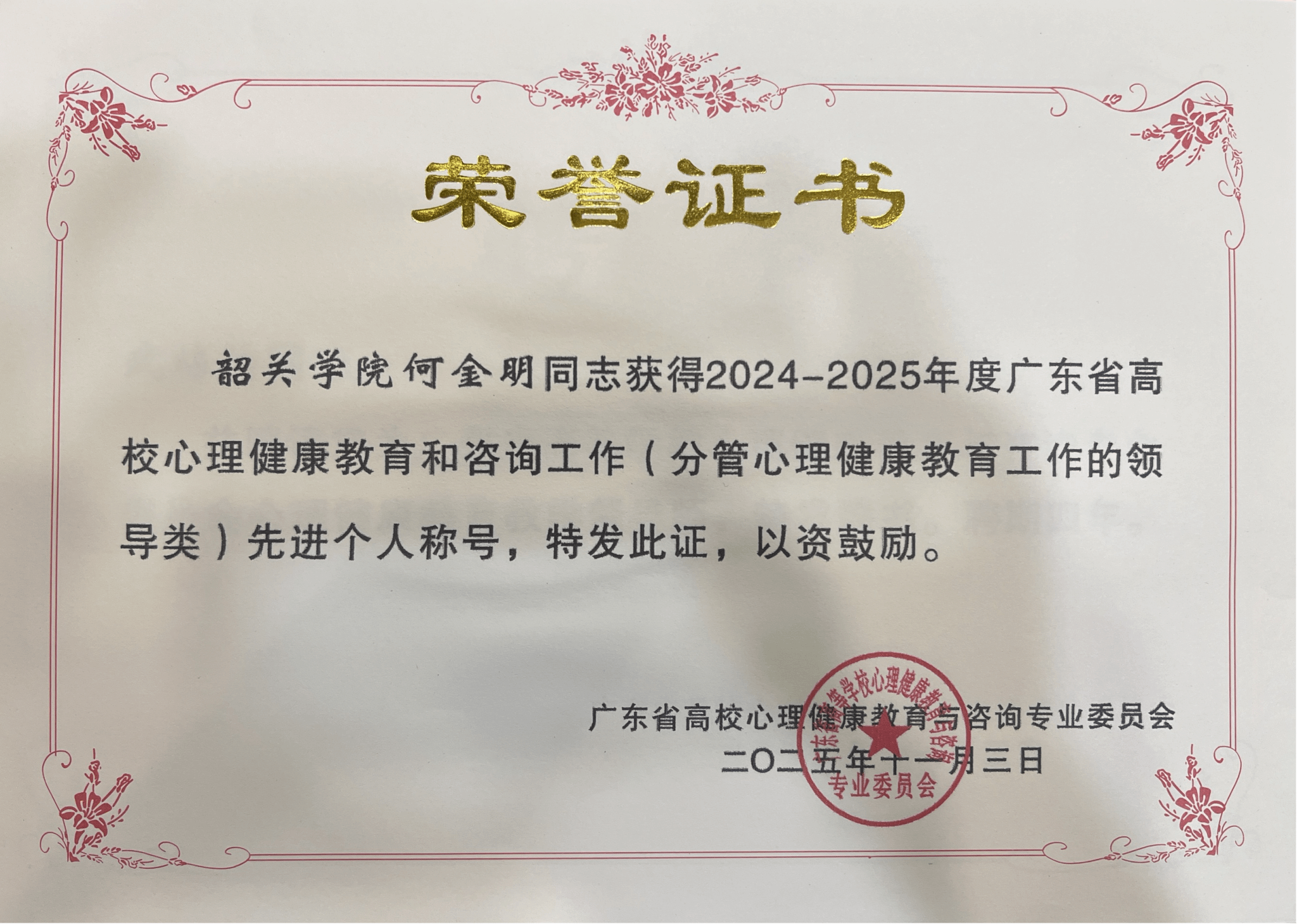 近年来,我校始终坚持“以学生发展为中心”的理念,系统推进心理健康教育“一体两翼”工作模式——以“心理育人体系建设”为主线,以“二级心理辅导站规范化管理”和“心理危机干预体系优化”为两翼,先后建成覆盖全校的二级心理辅导站网络,打造“心理健康教育课程—团体辅导—危机干预—科研创新”四位一体的心理育人体系,构建全校“预防—辅导—干预—转介—跟踪”五级协同机制,切实提升心理育人实效。此次获奖,不仅是对我校心理健康教育与咨询工作的高度肯定,更是对学校心理健康教育与咨询工作的鞭策与鼓舞。在下一步工作中,我校将继续秉持立德树人根本任务,深入落实“五育并举”教育理念,积极探索心理健康教育与思想政治教育融合发展的新路径,为建设学生幸福校园、助力教育强国贡献“韶院力量”。