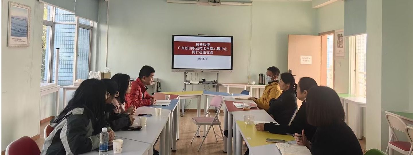 1月15日上午,广东松山职业技术学院心理健康教育与咨询中心一行莅临我校心理健康教育与咨询中心,围绕高校心理健康教育工作展开深入交流。本次交流聚焦大学生心理健康教育课程建设、心理咨询与危机干预、二级心理辅导站运行三大主题,双方紧密结合工作实际,分享经验,探讨创新路径。