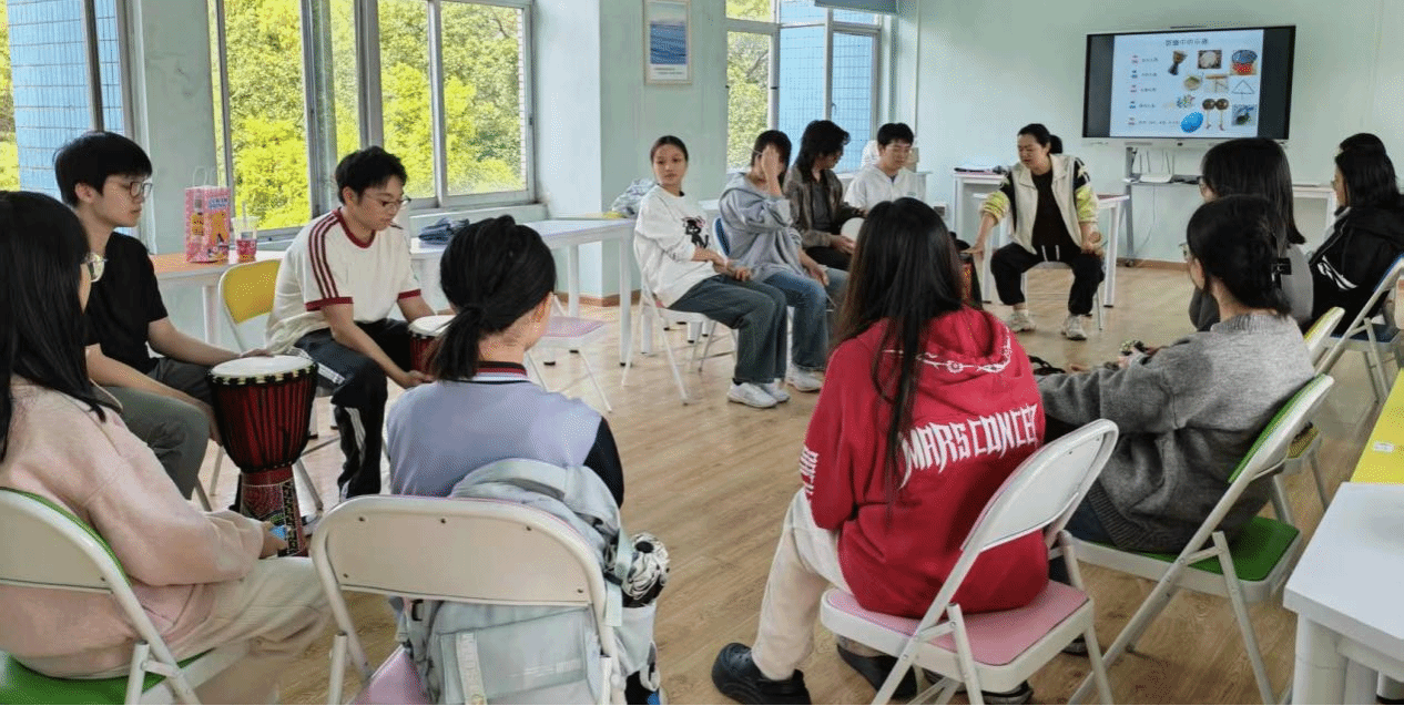 在第二期培训的实际体验环节,占老师引导志愿者们围坐成圈,以非洲鼓、木鱼、三角铁等各类乐器为媒介,通过拍打、节奏模仿与即兴创作,开启了一场心灵探索之旅。现场鼓点此起彼伏,从杂乱无章到逐渐同频共振,志愿者们在酣畅淋漓的鼓声中释放了压力,也深刻体会到了“同频共振”带来的归属感与治愈力。