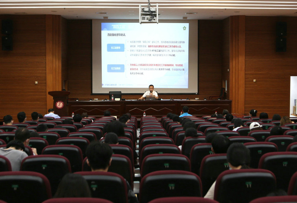 何金明简要介绍了我校的发展历史、学科专业设置、人才培养及毕业生就业等情况,希望通过本次宣讲会,让学生更加知晓、了解“双百工程”,积极主动参与到“双百工程”中来,发挥社会工作专业、心理学专业毕业生在基本民生保障、基层社会治理、基本社会服务等方面的积极作用,为建成具有广东特色的兜底民生服务体系贡献青春力量。