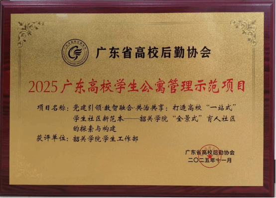 近日,2025年广东高校后勤学生公寓管理示范项目名单正式公布,韶关学院报送的《党建引领・数智融合・共治共享:打造高校“一站式”学生社区新范本 —— 韶关学院“全景式”育人社区的探索与构建》成功入选!全省仅10个项目获此殊荣,这是对我校学生社区育人工作的高度肯定,更是我校扎根粤北、创新育人模式的实力彰显!