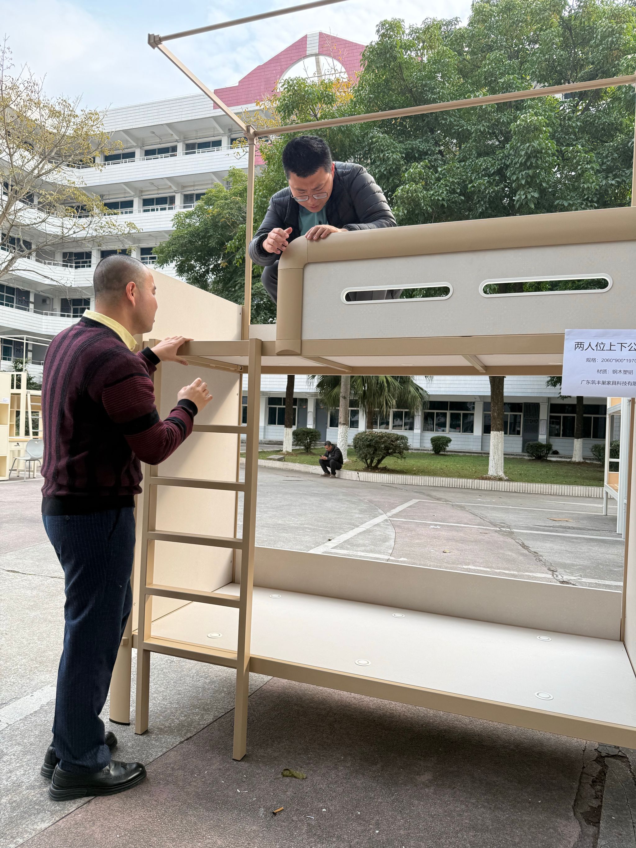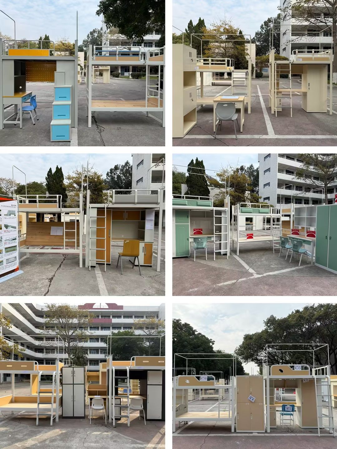 本次实物展示活动选址于学校思源区思齐楼前小广场,供货商们(两家缺席)依次陈列了床、书桌、衣柜、座椅等核心宿舍家具品类,涵盖实木、环保板材、铝合金、冷轧钢等多种材质,同时展示了带储物功能书桌、静音抽屉导轨等产品。