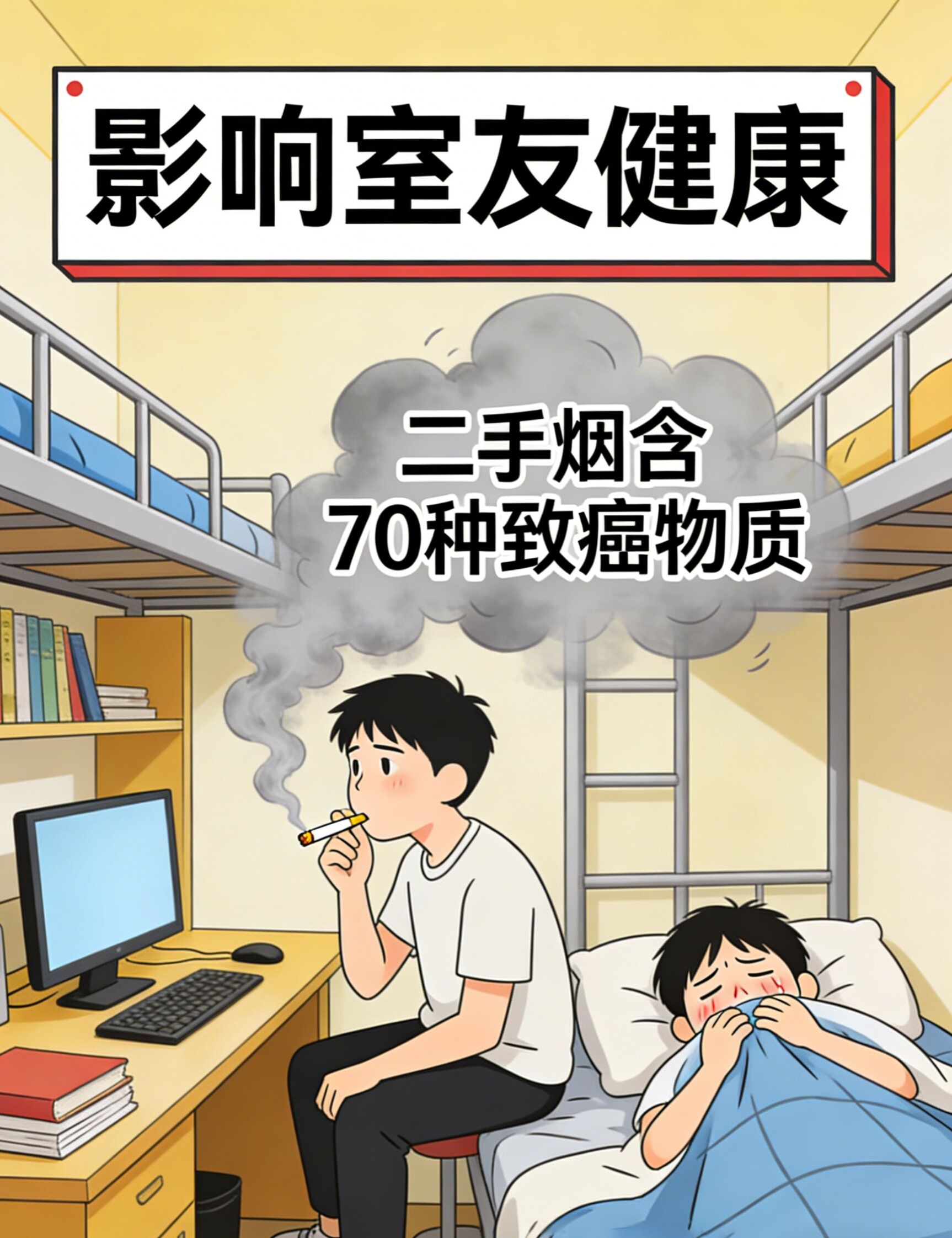 宿舍吸烟不仅害自己,更坑舍友!二手烟藏上百种有毒物质,还有致癌物,长期吸入伤害身体,即使烟灭了,衣物、被褥上的三手烟还会持续释放有害物质,像无形的“健康杀手”,悄悄侵蚀室友的身体。舍友之间本就该守望相助、互相体谅,别因一己之便,既伤了健康,又毁了同窗情。