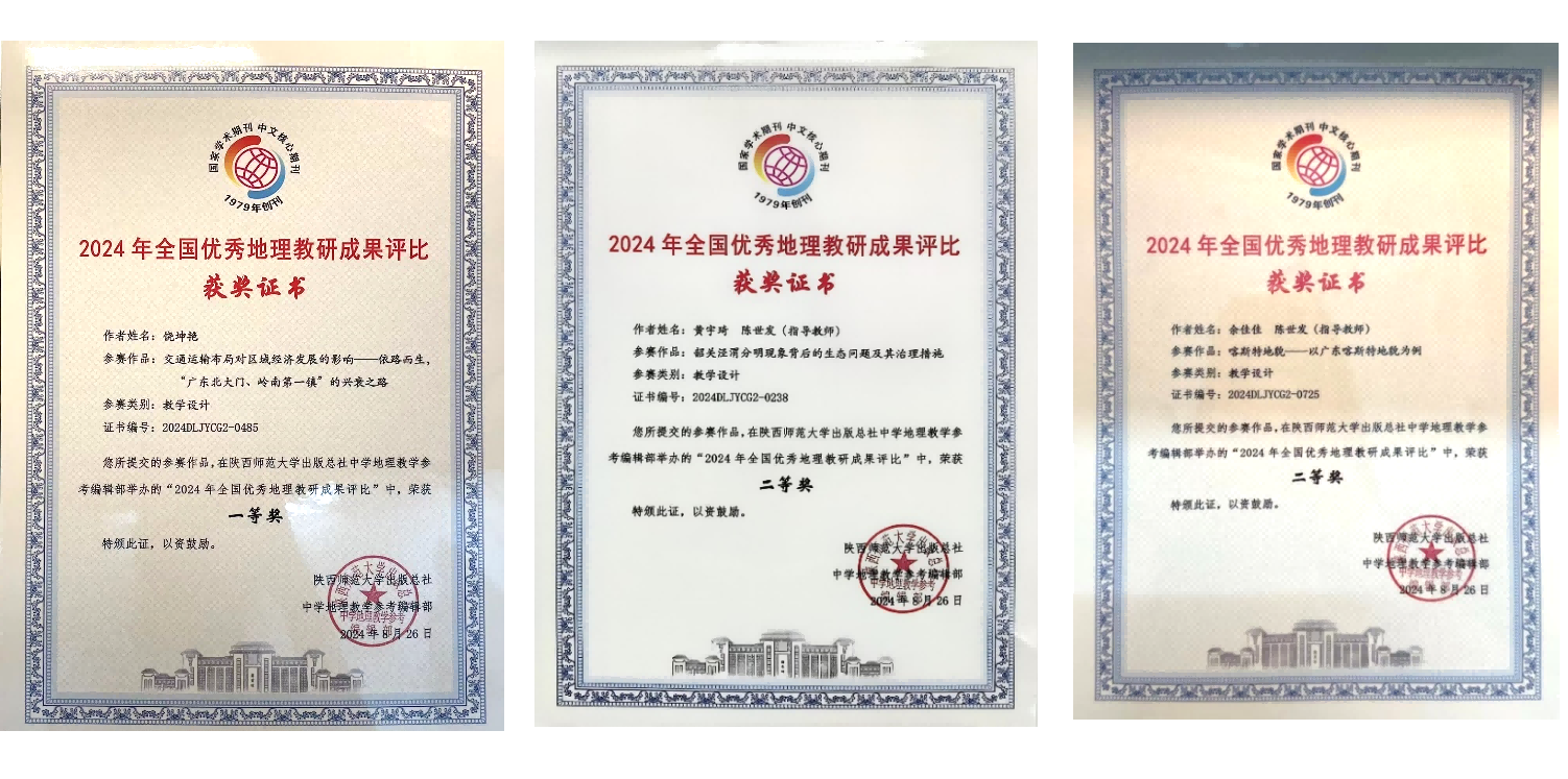 近日,由《中学地理教学参考》编辑部举办的2024年“全国优秀地理教研成果评比”活动落下帷幕。我校旅游与地理学院陈世发老师指导的学生饶坤艳荣获一等奖(教学设计类),黄宇琦、余佳佳荣获二等奖(教学设计类)。