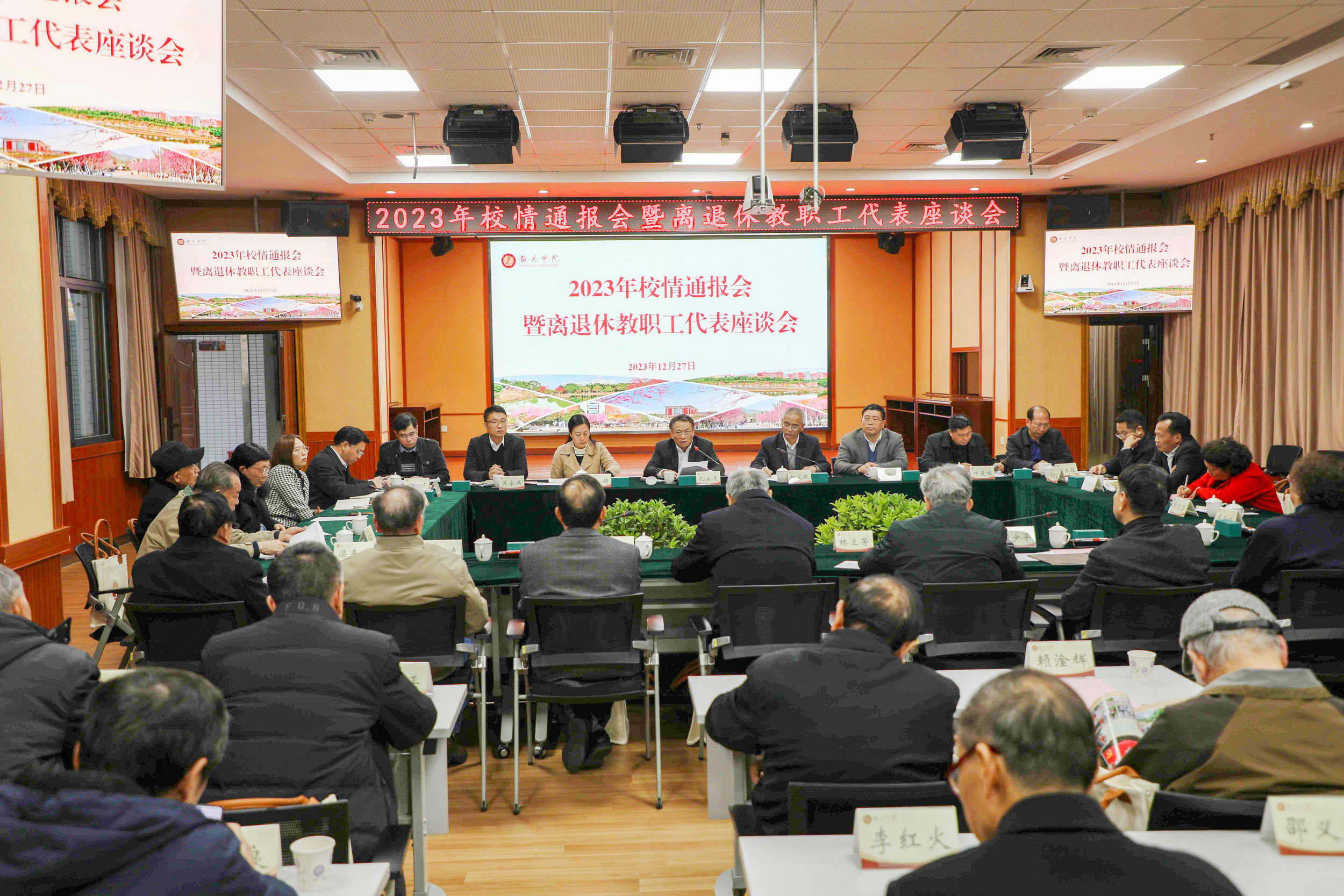 12月27日下午,我校召开2023年校情通报会暨离退休教职工代表座谈会。校党委书记孔云龙、副校长赵三银,学校原校长林立芳、学校党委原副书记、纪委原书记黄志才,学校党委原副书记胡少平、学校党委原副书记姚红光和40多位离退休干部代表共叙情谊,畅谈发展。会议由赵三银主持。