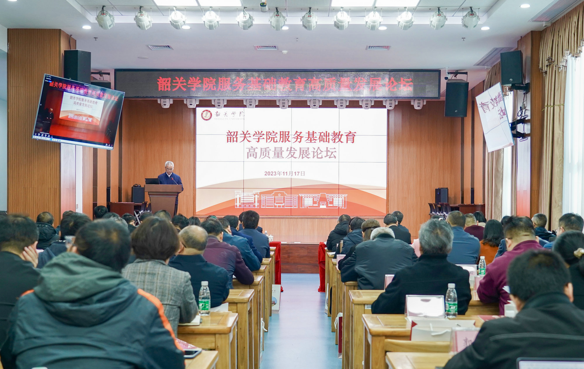 韶关市教育局、清远市教育局、部分县(市、区)教育局领导,韶关市、清远市部分中小学校长、幼儿园园长,学校相关职能部门负责人、师范专业负责人、新师范助推基础教育高质量发展专家及学生代表,以及11个韶关市科创教育与学科融合创新基地学校分会场的领导和老师近400人参会。