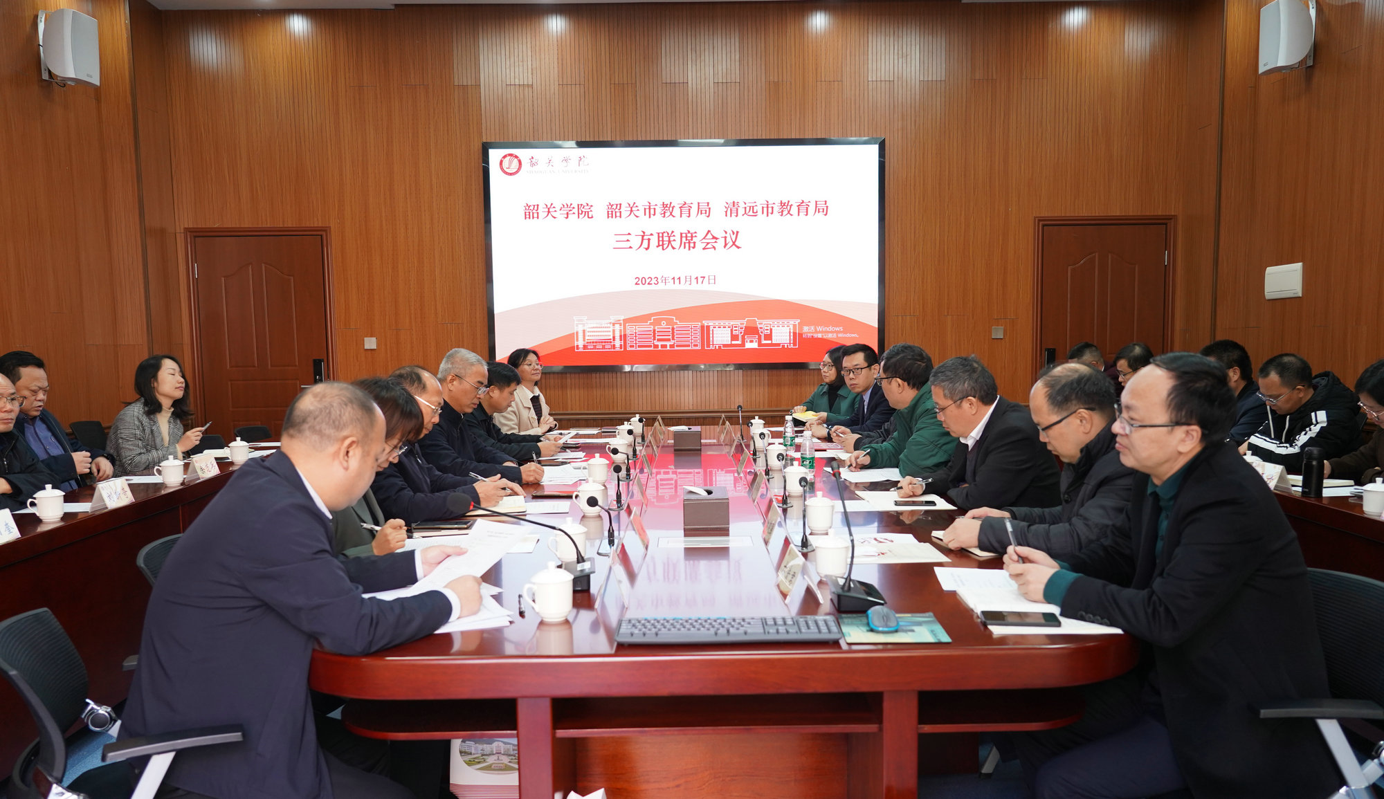 专题讲座后,我校与韶关市教育局、清远市教育局共同召开三方联席会,围绕如何进一步发挥学校资源和特色,加强师资培训、实习生选派、教科研指导等工作,推进韶关、清远基础教育高质量发展进行座谈交流。赵三银表示,学校今后将继续加强统筹谋划,盘活校内资源,集聚帮扶合力,研究出台更加务实有效的政策举措,为推动韶关、清远基础教育提质升级,形成高等教育反哺基础教育的新格局持续贡献韶院力量。