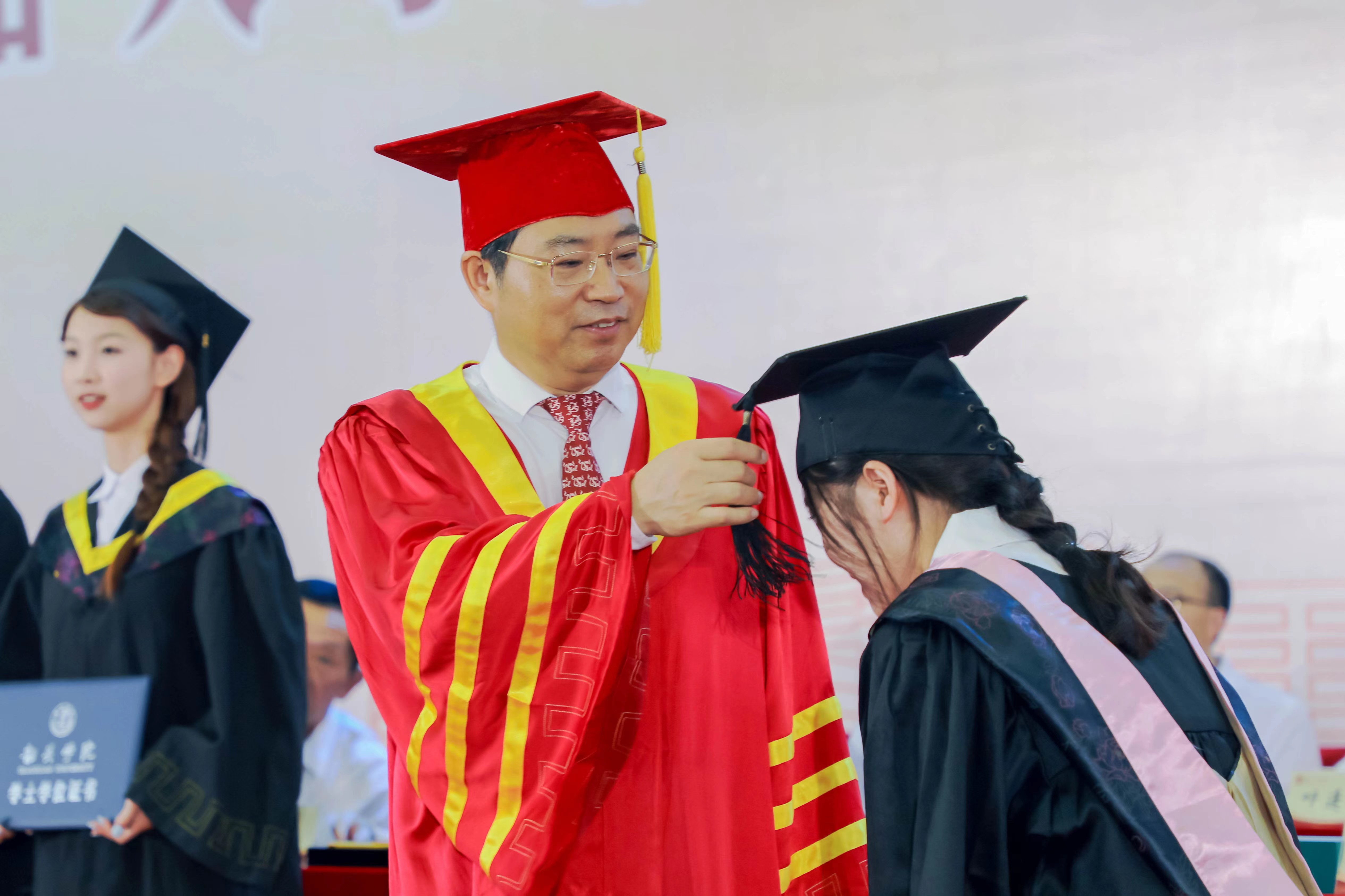 在学士学位授予仪式上,赵三银宣读学士学位授予决定。廖益为2020届、2021届、2022届、2023届毕业生代表,2023届援藏援疆支教志愿者、退伍复学毕业生代表拨穗并颁发学位证书。