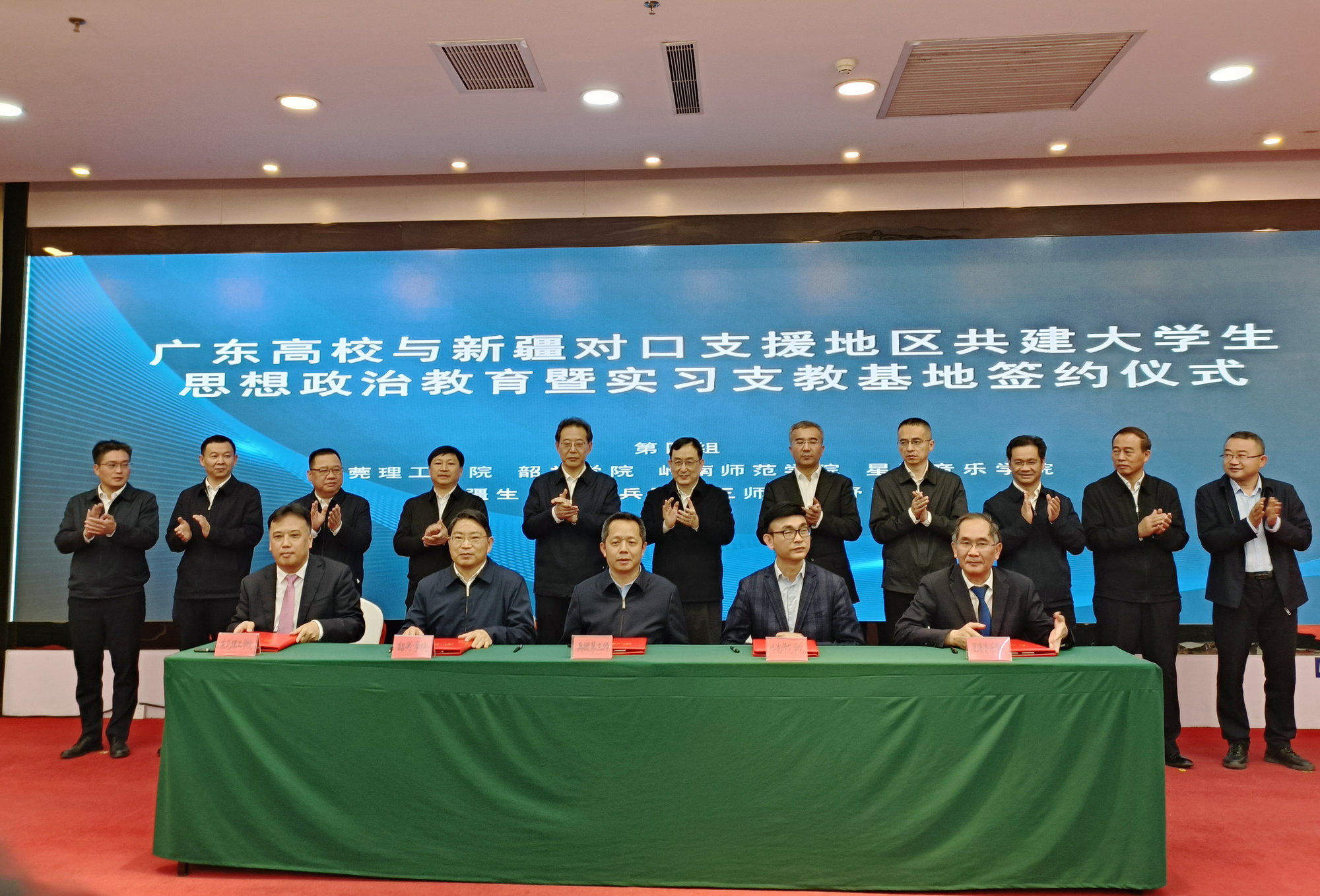 3月26日,在王曦常委带领下,广东16所高校赴新疆喀什地区参加广东高校与新疆对口支援地区共建大学生思想政治教育暨实习支教基地(以下简称“校地共建”)签约仪式。粤新两地领导出席签约仪式,广东省委常委、副省长王曦,自治区人民政府副主席凯赛尔·阿不都克热木,新疆生产建设兵团党委常委、副司令员李永红参加活动并讲话。签约仪式由广东省教育厅党组书记、厅长朱孔军主持。我校校长廖益,副校长何金明参加活动。仪式上,我校和东莞理工学院、岭南师范学院、星海音乐学院四所学校,与新疆生产建设兵团第三师签署了合作协议。