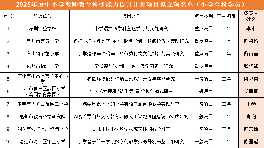 近日,省教育厅公布2025年中小学教师教育科研能力提升计划项目立项名单,由我校承办的广东省中小学“百千万人才培养工程”省级培养项目——小学全科项目学员共获得10项省级课题,其中包括重点项目4项、一般项目6项。据悉,为帮助学员提高申报成功率,我校在项目申报前,专门组织专家围绕课题选题、研究设计、申报书撰写等方面,全方位提升学员的科研素养。同时,组织专家对学员的课题申报书进行3轮打磨,提出修改意见,再由学员根据专家意见修改完善申报书,有效确保了申报书的质量。 深圳实验学校李湘老师作为此次获得重点项目立项的学员之一,对我校表达了由衷的感谢:“在韶关学院省级中小学教师发展中心的培训中,我得到了专家的深度指导,整个过程虽然非常磨人,但是确实让我成长了许多,感谢韶关学院,也感谢专家们的用心指导。”
