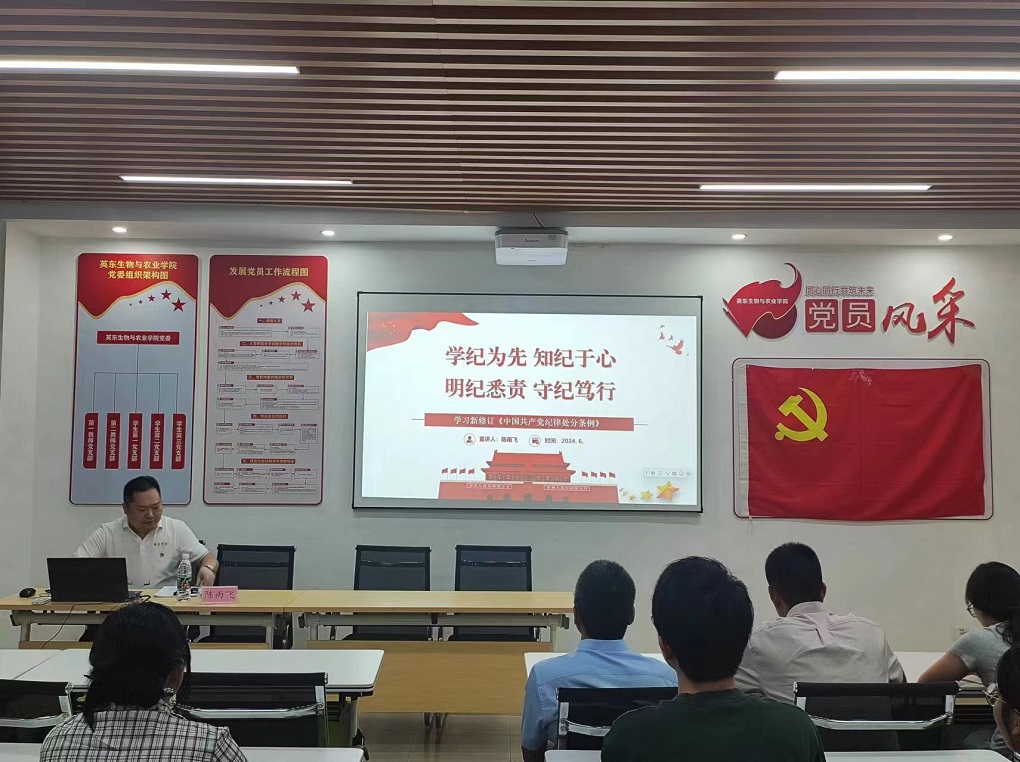陈雨飞以“学纪为先 知纪于心 明纪悉责 守纪笃行”为主题为全体党员讲授专题党课,围绕深刻认识开展党纪学习教育的重要意义、全面抓实六项纪律落地落实、注重党纪学习的实践运用三方面展开讲授,强调全体党员要把学习党的纪律与日常工作、学习生活等紧密结合,自觉严守“六大纪律”,把遵规守纪刻印在心、外化于行,切实做到学纪、知纪、明纪、守纪,始终做到忠诚干净担当,把好纪律的准绳,为学校高质量发展保驾护航。