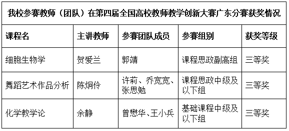 近日,第四届全国高校教师教学创新大赛广东分赛决赛结果揭晓。我校共7位教师(团队)参加本届大赛,其中,3位教师(团队)进入现场决赛。经过激烈角逐,我校贺爱兰、陈炯伶、余静3位教师(团队)凭借稳定出色的发挥,分别荣获三等奖,获奖数量创历史新高。