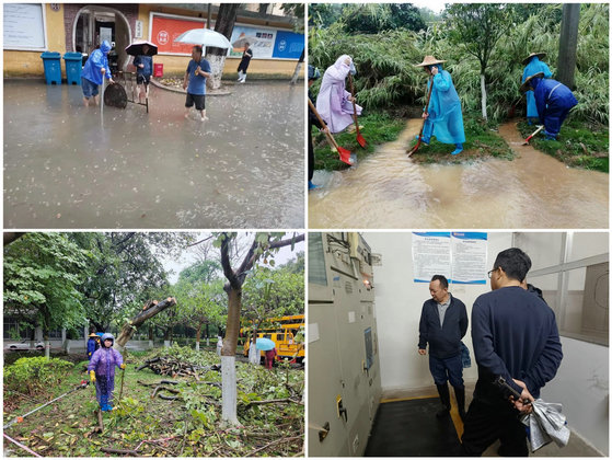 迎难而上,化解风险。因暴雨强度大,频率高,持续时间长、累积雨量大,并伴有大风强雷电,雨水夹带淤泥、杂草、树叶等杂物汇入下水道,低洼处积水、水电设施设备遭雷击损坏,树木出现断枝倒伏现象,各校区均受到不同程度影响。党员干部和员工责任在肩、迎难而上,出动近300人次,冒雨参与应急抢险工作,梳理清单,制定举措,按照轻重缓急,难易程度,分步分类解决。处置因极端天气造成的配电房停电事故1次,二次供水变频恒压设备抢修1次,电梯故障抢修3次,及时恢复供电供水和电梯运行。对韶乐园6处湖泊进行泄洪,处置树木断枝及倒伏34处、疏通下水道78条,低洼内涝点6个,清理沙井口661个,道路、隧道、楼宇积水点10个,堆砌沙袋防洪墙2段,修理加固路灯宣传牌7个,迅速做好排水、清淤、加固、移除、保畅工作,确保把灾害天气造成的损失及对师生生活学习的影响降到最低。