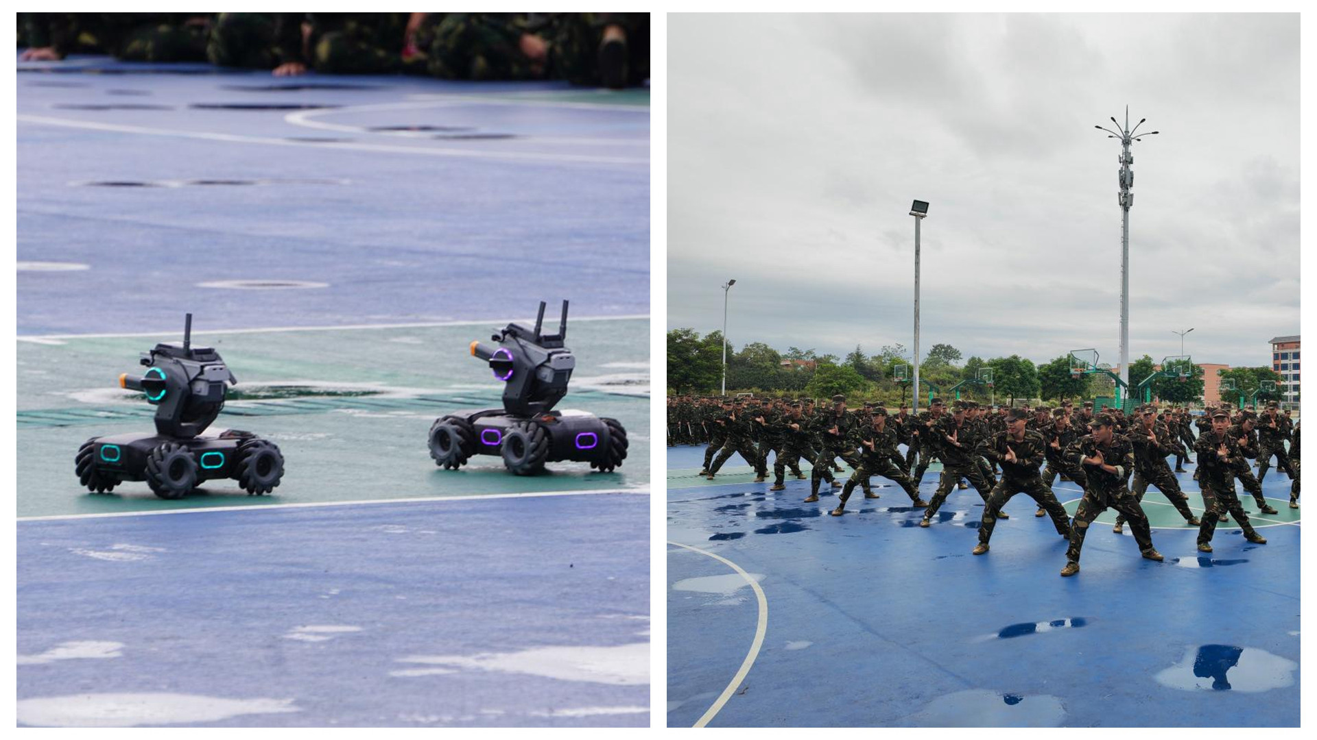 在会操考核环节,新生们以整齐划一的步伐、响亮有力的口号以及昂扬向上的精神面貌,充分展示了在过去两周里的军训训练成果。紧接着,由新生组成的无人战斗训练小队展示了无人战斗技术训练成果。