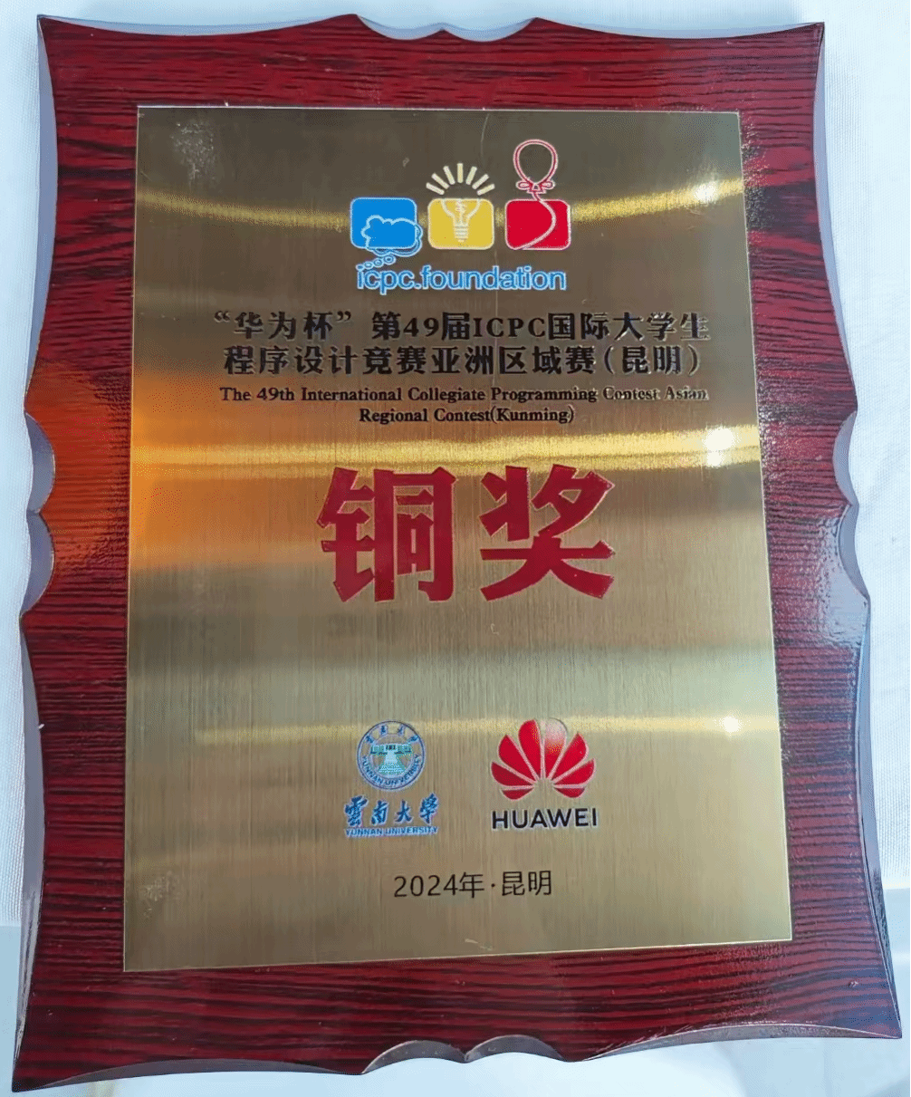 12月1日,第49届ICPC国际大学生程序设计竞赛亚洲区域赛(昆明)在云南大学顺利举办,经选拔入围的包括北京大学、清华大学、香港中文大学、香港科技大学等272所高校的449支团队参与了赛事奖项角逐,我校学生冯诺维、康丁魁、陈兴翰团队顽强拼搏,在最后一小时封榜时段内过题进入奖牌区,喜获铜奖,高校排名第142位。这是继2023年ICPC济南站后,我校第二次获得亚洲区域赛铜奖。