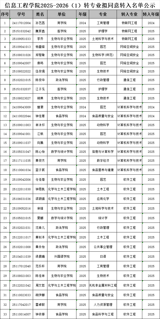 根据《韶关学院全日制本科学生转专业实施办法》(韶院教【2025】33号)、学校“关于做好2025-2026学年第一学期全日制普通学生转专业工作的通知”的精神以及《信息工程学院(软件学院)-2025-2026学年第一学期全日制本专科学生转专业工作方案》的要求,经过各专业考核小组考核、学院会议讨论,现将拟推荐2025年秋季转专业转入学生名单予以公示(详见附件),如有异议,请按如下规定向学院提出。