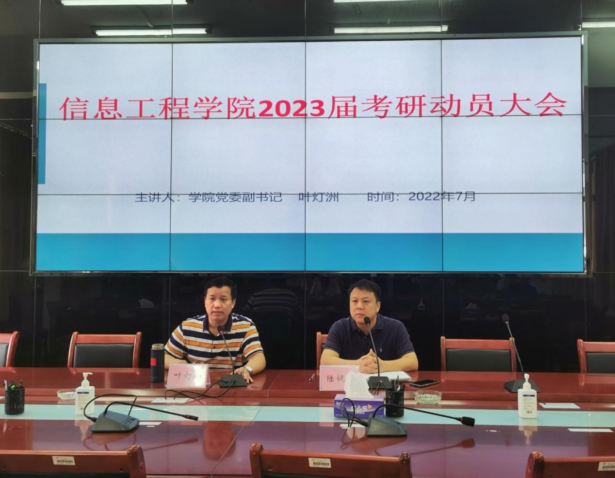 7月11日上午,信息工程学院在明德区才德楼A203会议室召开2023届考研动员会,学院党委副书记叶灯洲、副院长陆健强,2019级辅导员陈雪瑶和准备考研学生100多人参加了动员会。会议由叶灯洲主持。