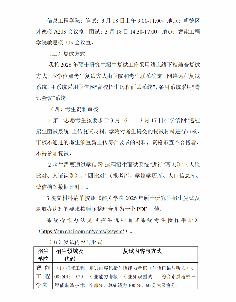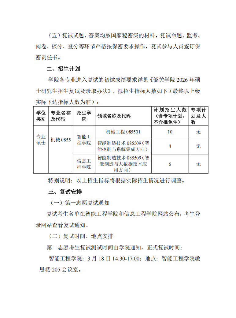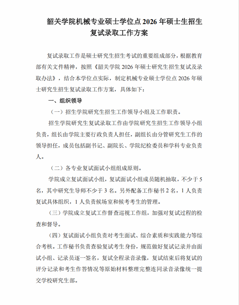 韶关学院机械专业硕士学位点 2026 年硕士生招生复试录取工作方案