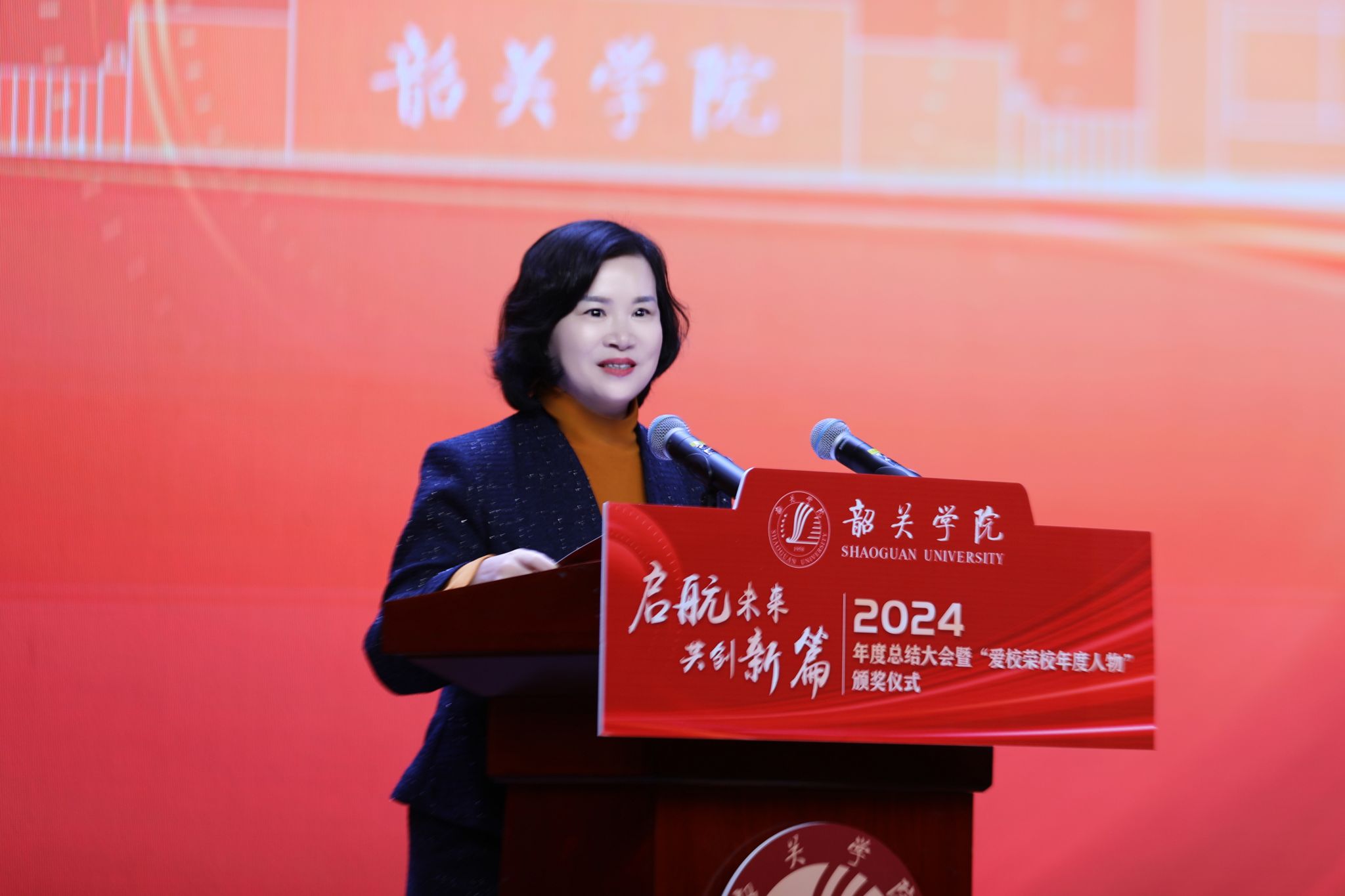 张晓红对获得“爱校荣校韶院年度人物”的个人和团队表示祝贺,对“光荣在校30年”的教师和荣休教师表示衷心的感谢。她表示,学校的发展成就是一代代韶院人锲而不舍、赓续奋斗、励精图治打拼出来的。“日月其迈,时岁盛新。”她以“新人”“新景”“新征程”三个关键词分享了未来展望。“赴新春,山海辽阔;迎新程,道路明辉。”她希望全体韶院人要坚定信念、勇往直前,一路追光逐梦、乘风破浪,以破釜沉舟的决心、破旧立新的雄心和破茧成蝶的信心,为实现韶关学院高质量发展的美好愿景不懈奋斗,共同为强国建设、民族复兴作出新的更大贡献,书写韶院的“高分答卷”。