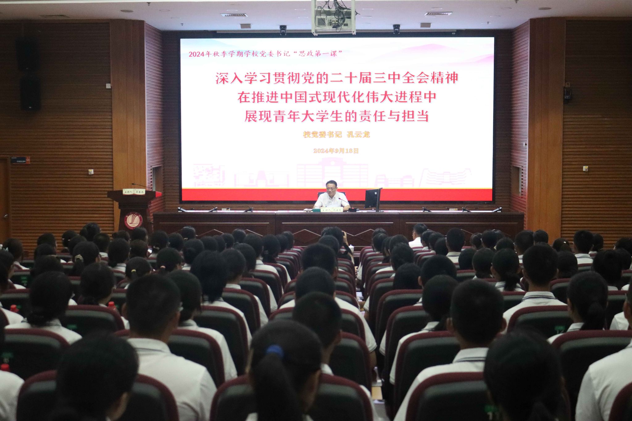9月18日下午,学校党委书记孔云龙以《深入学习贯彻党的二十届三中全会精神 在推进中国式现代化伟大进程中展现青年大学生的责任与担当》为题在明德楼学术报告厅为师生开讲“思政第一课”。本次“思政第一课”由学校党委副书记吴善添主持。...