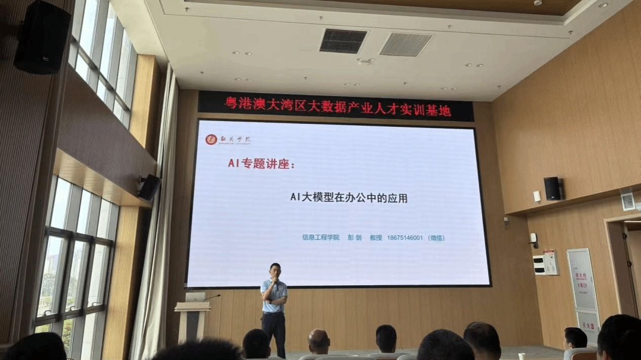 4月10日上午,应中共南雄市委党校邀请,信息工程学院彭剑教授赴粤港澳大湾区数据应用产业园,为南雄市58名乡科级领导干部作“AI大模型在办公中的应用”专题辅导。