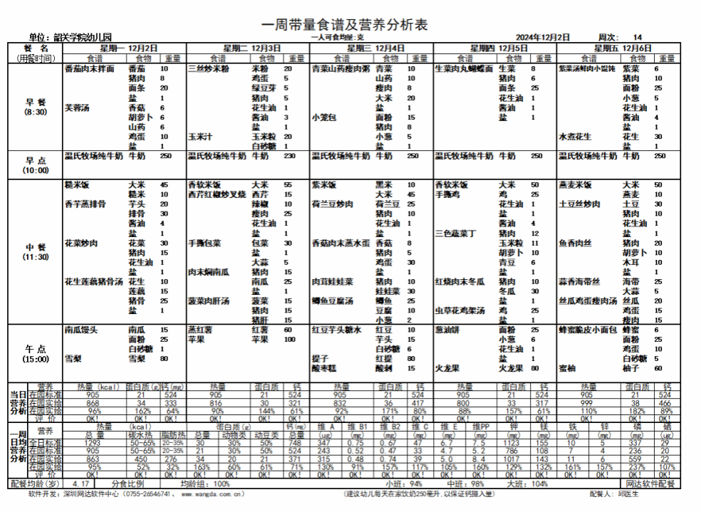 2024年12月2日-2024年12月6日 韶关学院幼儿园一周食谱