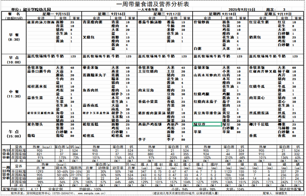 2025年9月15日-2025年9月19日 韶关学院幼儿园一周食谱