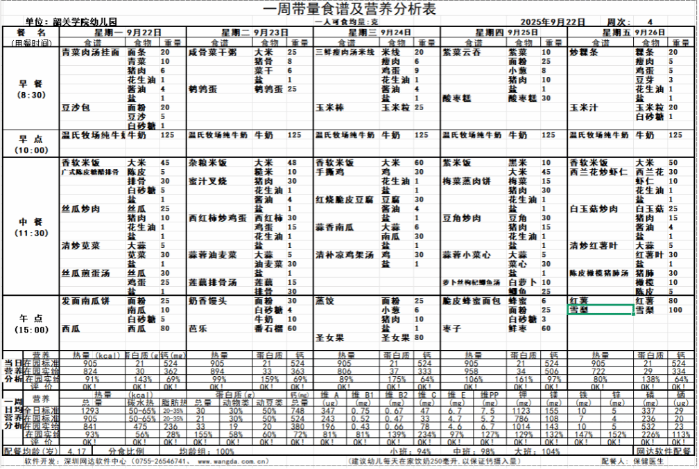 2025年9月22日-2025年9月26日 韶关学院幼儿园一周食谱