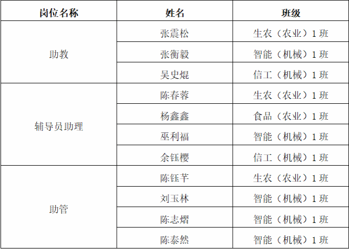 根据《关于开展2025-2026学年研究生“三助一辅”岗位招聘工作的通知》,经研究生申请、招生学院面试、研究生部审核,拟录用生农(农业)1班研究生张震松等11名同学为2025-2026学年研究生“三助一辅”岗位聘任人员(岗位拟录用名单详见附表),现予以公示,公示时间为三个工作日(2025年11月25日至2025年11月27日)。如有异议,请向研究生部反映。联系人:肖老师、刘老师,联系电话:0751-8120049。